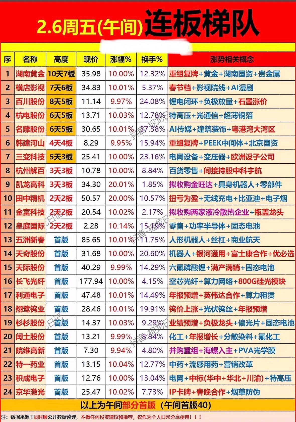 2.6周五强势股盘点,抓住涨停机会! 黄金影视锂电领涨,并购重组与AI概念活跃,市场热点多元轮动
