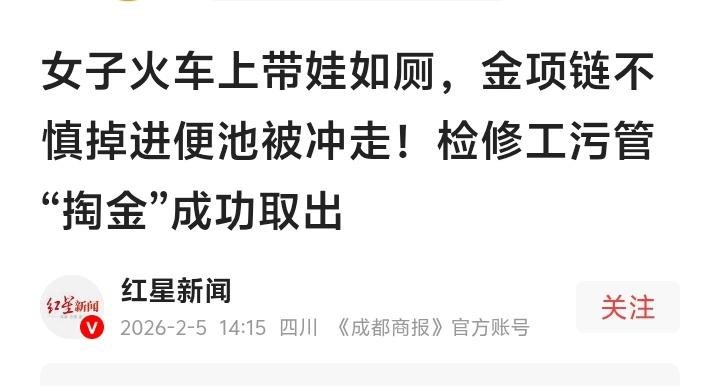 春运火车上惊魂一幕!女子带娃如厕结婚金项链被冲入污管,检修工忍恶臭40分钟“掏金”成功引爆全网泪点 当春运的列车载着归心似箭的人们飞驰,一场意外让包女士的心瞬间跌入谷底。仅仅是一次寻常的如厕,脖子上那根承载着婚姻信物的金项链竟滑落坠入深不见底的便池管道。那一刻,惊慌与无助吞噬了她,十几克的黄金,更是十几年的情意,难道就要这样消失在肮脏的污物之中? 她的第一反应是向乘务员求助。乘务员黄元波的果断处理,成了挽救希望的第一道曙光。他迅速切断电源、关闭厕所,防止项链被强大的负压吸入污物箱,那意味着真正的“大海捞针”。他用铁丝弯钩尝试,虽未成功,却稳住了乘客濒临崩溃的情绪。这份第一时间挺身而出的责任感,正是平凡岗位上最动人的微光。 希望看似渺茫,但铁路系统没有放弃。从乘务员到整备场值班室,信息在高效传递。包女士毅然决定跟随列车前往终点站襄阳。这个选择背后,是个人利益与庞大春运系统之间的一次微小博弈。拆解集污箱需耗费巨资并影响调度,但检修班组仍决定为了一位普通乘客,尝试那“有可能”的寻找。 最震撼的一幕在检修车间上演。检修工张雷钻入车厢底部,打开箱盖的瞬间,刺鼻的恶臭扑面而来。他需要蜷缩在狭窄空间,面对复杂管道,小心翼翼地探查。这不是简单的维修,而是在守护管道完好的前提下进行一场精细的“手术”。每一分努力,都透着对乘客财产的尊重。 四十分钟的坚持,需要怎样的忍耐力?在浑浊与恶臭中,他调整工具,仔细摸索。当手电筒光束终于捕捉到那一抹金色时,所有的付出都有了意义。屏住呼吸,精准操作,当完整的金项链被取出,这已不仅是找回一件失物,更是从冰冷机械与污秽中打捞起一份温暖的人情。 项链失而复得,包女士的感激溢于言表。而张雷一句打趣的“职业生涯第一次淘金”,举重若轻地化解了紧张,透露出劳动者的朴实与幽默。这背后,是无数铁路人在春运背后默默付出的缩影,他们保障的不仅是行车安全,还有旅途中的每一份安心。 事件经报道后,迅速点燃网络。有人为铁路人的敬业点赞,称其为“最可爱的人”;也有人引发讨论,提醒公众注意保管财物。不同的声音,恰恰证明了这件事击中了人们心中关于善意、责任与公共资源使用的思考触点。它让我们看到,体系的高效与个体的敬业相结合,能创造出超越期待的温暖。 这不仅仅是一个“好人好事”。它让我们洞见,在高度机械化、系统化的现代服务中,人的温度依然无可替代。那份为了一位乘客而不厌其烦的努力,那份在污秽面前依然坚守的职责,正是社会信任基石中最珍贵的一部分。这份正能量,值得我们传递与铭记。 (来源:综合汉水襄阳、法治进行时、红星新闻等媒体报道) 春运暖心故事 凡人微光