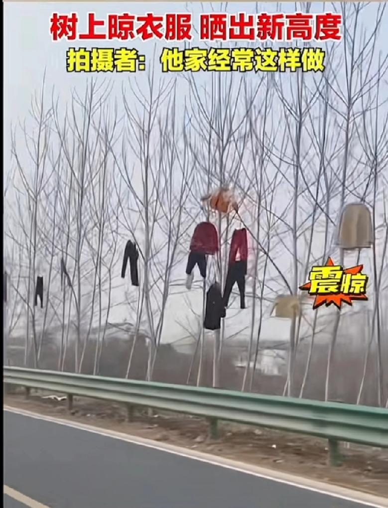 晾衣服亮出新高度,马路边的树杈上惊现一排衣服。 这晾衣绳真是经济实惠,家住在马路旁边,就地取材充分利用资源。 熟悉他家的人说这是他家的常规操作了,洗了衣服常常就晾在路边挂在树上。现在被发现了,说不定还能成为网红打卡地。晾衣晒衣绳 晾衣方式