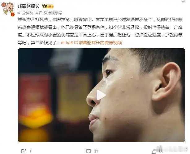 北京时间2月6日,22岁的崔永熙在缺席CBA第一阶段前23场比赛后,如今根据媒体人球圈赵探长报道,崔永熙不会出战接下来的杯赛,他将在第二阶段复出迎来加盟广东首秀。