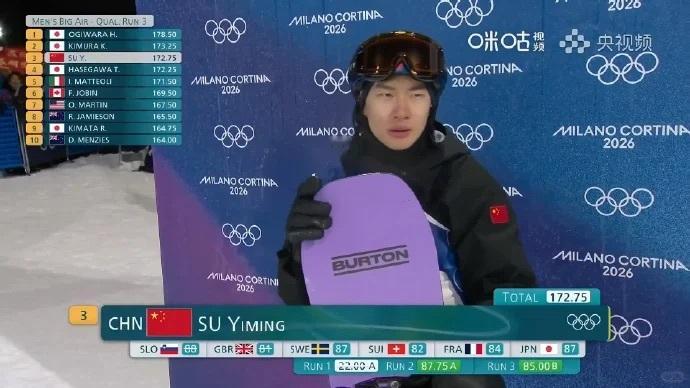 苏翊鸣称不是很满意资格赛表现米兰冬奥会单板大跳台资格赛,苏翊鸣首跳失误后绝地反击,后两跳拿下87.75+85.00分,总分第4惊险晋级决赛!坦言首跳紧张失常,靠教练反向暗示调整状态,决赛将放手享受比赛✨