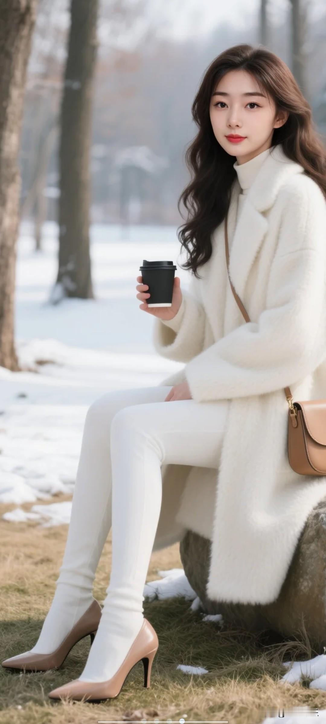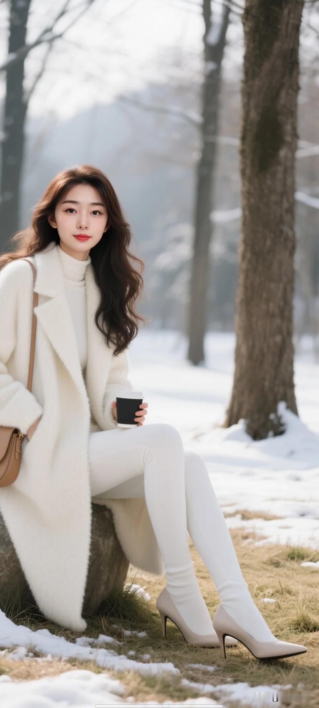 大衣,白色厚打底裤,跟雪景跟配。打底裤