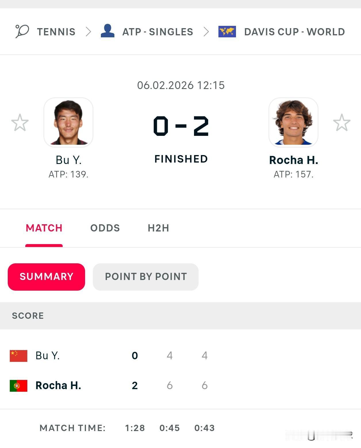 戴维斯杯世界1组附加赛 中国vs葡萄牙 🇨🇳布云朝克特4-6/4-6不敌罗沙 接下来看吴易昺了。