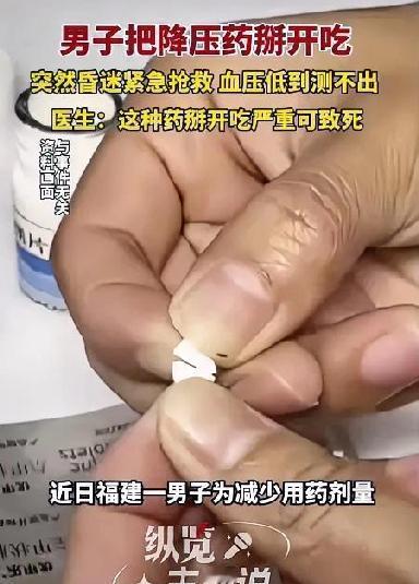 特别注意!男子掰开降压药服用30分钟后昏迷 血压低至测不出险丧命! 近日,福建一名52岁男子因擅自掰开缓释型降压药服用,引发急性低血压危象,30分钟内陷入昏迷,血压低到仪器无法测出,经医院紧急抢救才脱离生命危险,这起因错误用药导致的意外再次为公众敲响用药安全的警钟。 据了解,该男子张先生(化名)患原发性高血压多年,一直规律服药控制病情。事发当日清晨,他自测血压160/95mmHg略高于平时,因急于快速降压,未咨询医生或药师,便将需整片吞服的硝苯地平缓释片掰成两半服用。不料服药仅30分钟,张先生便出现极度乏力、视物模糊等症状,随即倒地昏迷,家人发现后立即拨打120送医。 医院急诊科为张先生开通绿色通道时,其血压已降至80/50mmHg,心率减慢且血氧饱和度骤降,处于浅昏迷状态。医护人员立即给予吸氧、静脉升压、心电监护等急救措施,经诊断,张先生因药物结构被破坏引发药物突释效应,导致急性低血压性脑灌注不足。经过48小时重症监护治疗,其血压逐步回升至正常水平,神志才恢复清醒。 接诊医生解释,缓释、控释类降压药采用特殊工艺制作,外层的缓释膜或内部微孔结构能让药物24小时缓慢释放,维持稳定血药浓度。一旦掰开、碾碎或咀嚼,药物会瞬间大量释放,相当于一次性摄入数倍安全剂量,导致外周血管过度扩张,血压断崖式下降,严重时可引发休克、心律失常甚至猝死。而张先生服用的硝苯地平缓释片,正常整片服用血药浓度峰值出现在服药后6-12小时,掰开后药效瞬间爆发,才引发了危急状况。 专家明确表示,药名中带有缓释、控释、肠溶字样的药物,均需整片吞服,仅有部分标注清晰刻痕且说明书明确说明的缓释片,可沿刻痕掰开,且严禁咀嚼研磨。 这一事件提醒我们,对于高血压等慢性病患者而言,遵医嘱用药是基本准则,切勿凭自我感觉随意调整剂量、改变服药方式,更不能用“想当然”的经验代替专业指导。当出现血压波动或服药困难时,及时咨询医生、药师,更换合适剂型或规格,才是最安全的选择。同时,药品说明书是最权威的用药指南,服用任何药物前,仔细阅读用法用量和注意事项,看似繁琐,却是守护生命健康的第一道防线。