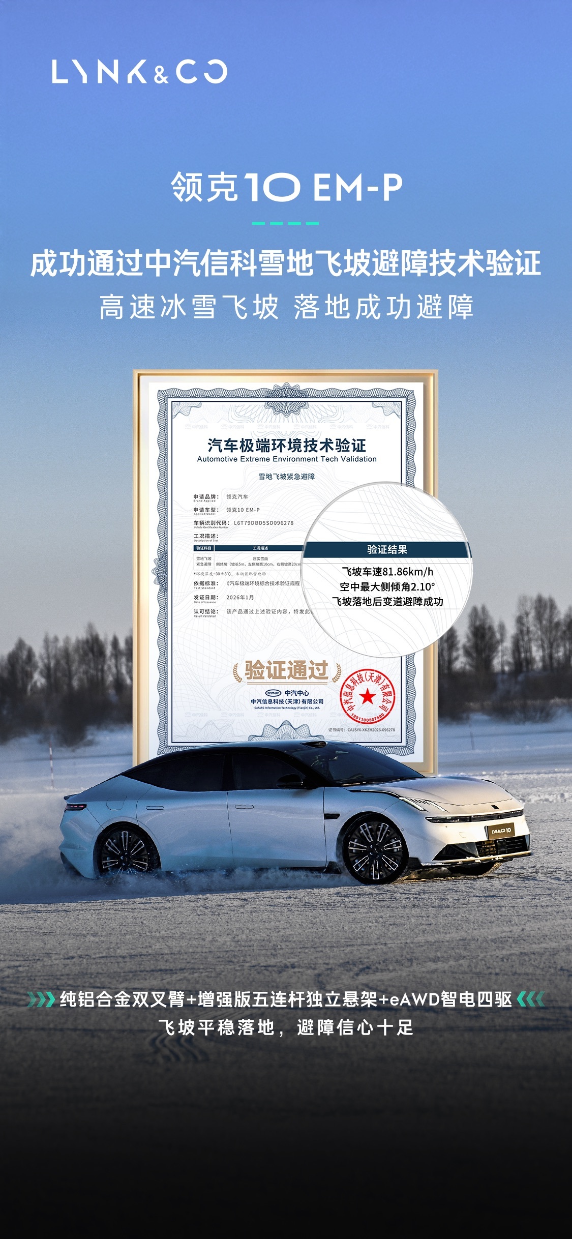除了能耗优秀以外,安全和操控一直都是领克都基因,即便在冰雪环境下,也要拥有良好的性能和操控,车辆的稳定性至关重要,遇到紧急情况可以救命。领克10EM-P全系四驱,冬季出行更安心,遇到冰雪路面更从容,不容易打滑,不容易陷车。此前,领克10EM-P在极寒冰雪环境下成功挑战麋鹿、雪地绕桩、对开坡道起步测试,实测麋鹿成绩52km/h,雪地绕桩姿态平稳循迹好、30%雪坡爬坡不打滑;本次领克10EM-P难度再加码,挑战雪地飞坡紧急避障,从长度5米、左侧坡高10厘米、右侧坡高20厘米的侧倾雪坡飞跃而下,实测飞坡车速81.86km/h,空中最大侧倾角2.10°,飞坡落地后变道避障成功。不打滑、不溜车、不甩尾、不失控,领克10EM-P不仅将冰雪路况的操稳性拉满,更将用户冬季出行的安全感拉满。
