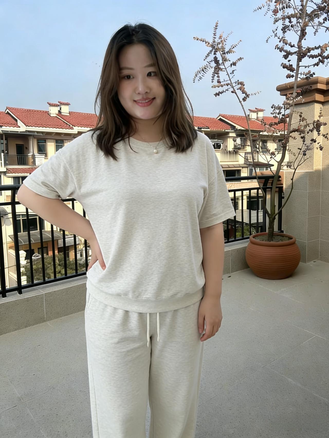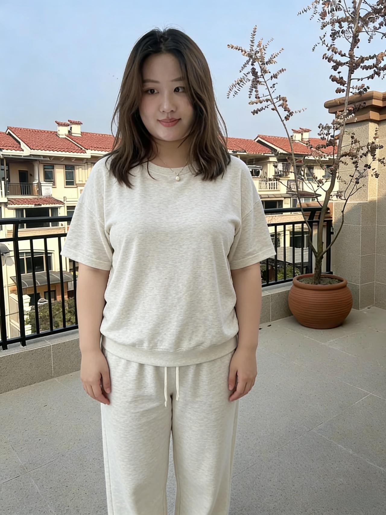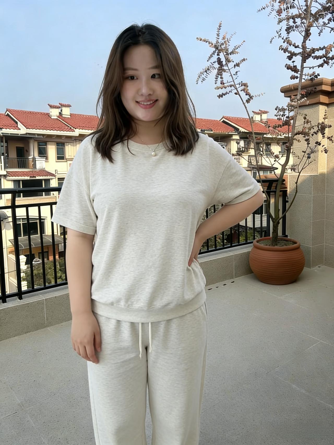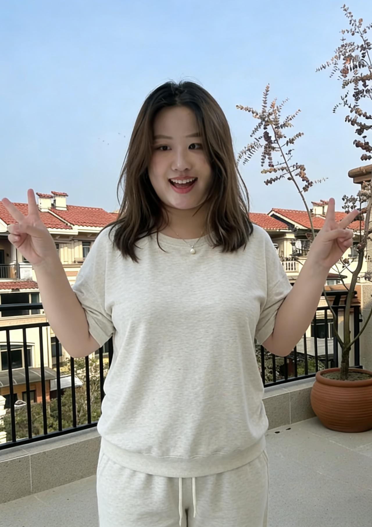 她站在正午的露台,像一块被阳光揉软的云 米白的衣料里,盛着半城的风和浅淡的春 红瓦屋顶在身后铺展成安静的背景 她的笑是檐角垂落的光,轻得像一声呼吸 ~ 有时她把手背在身后,像藏起半颗跳动的星 有时比出剪刀手,让风都跟着弯起眼睛 影子在水泥地上铺开,是另一个温柔的她 跟着她的脚步,轻轻摇晃,轻轻停 ~ 风穿过她的发梢,带起细碎的波纹 远处的树影在动,她的目光却很稳 像春日里慢慢流淌的河,不追赶什么 只把此刻的暖,酿成眼底的星辰 我看见她站在那里,站成一首松弛的诗 不需要修饰,不需要刻意的韵 阳光落在她肩上,就足够让时间慢下来 让所有路过的风,都想在她身边多停几分