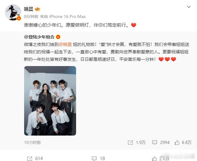 姚晨祝福登陆少年 登陆少年感谢姚晨的礼物,姚晨回复登陆少年:“谢谢暖心的少年们。愿爱做明灯,伴你们笃定前行。” 愿top带着姐姐送的祝福一起走下去,一直做心中有爱,勇敢向世界奉献爱意的人。大家都要越快越好!2025微博之夜爆款创作大赛