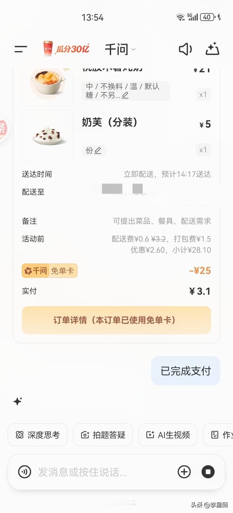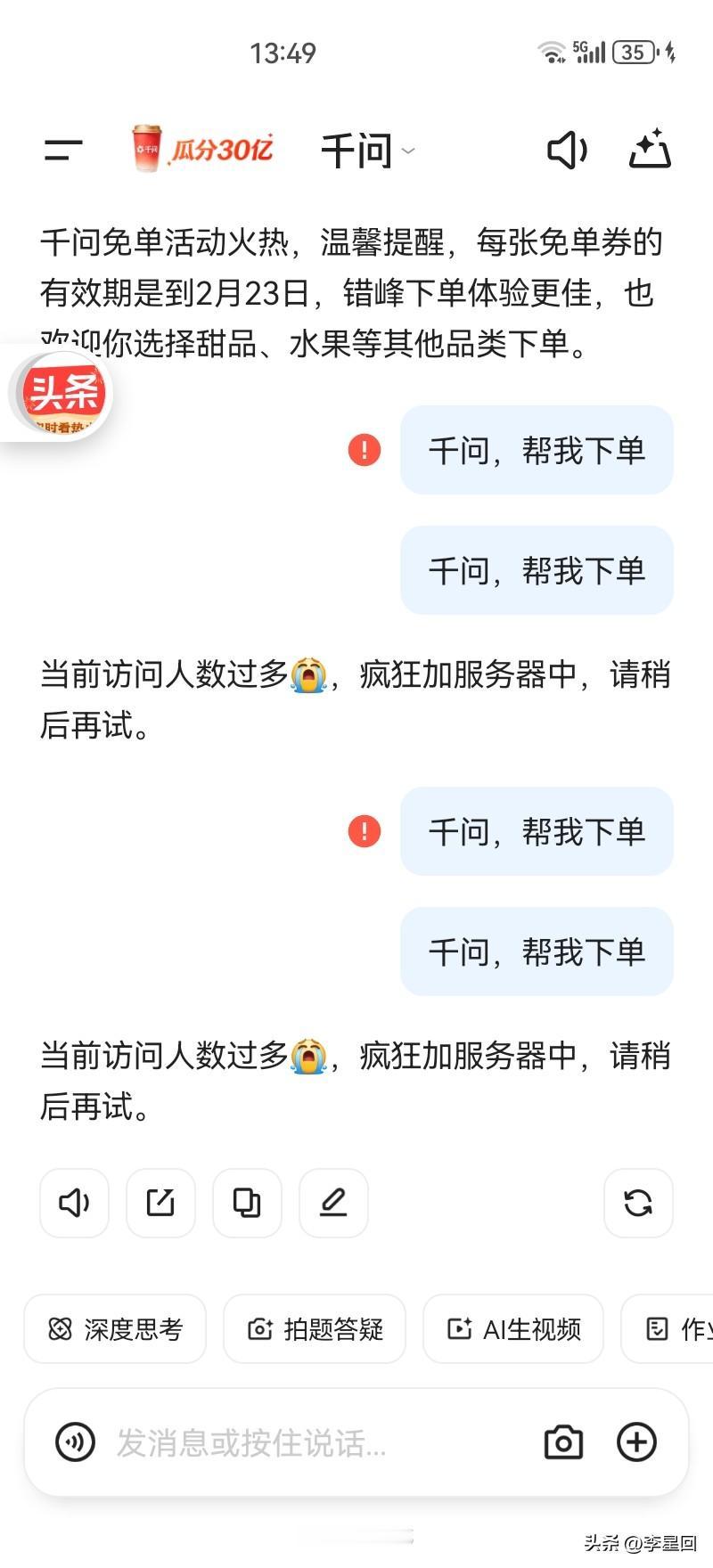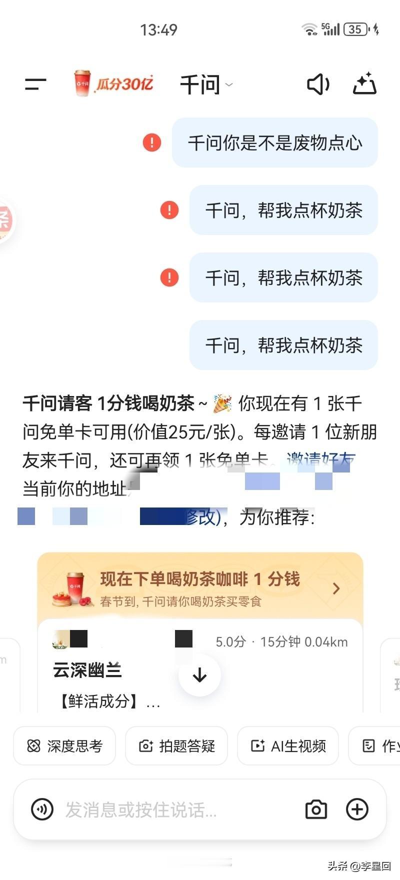 春节AI大战,元宝开局,千问点卯,砸钱大家都能做到,但是能让用户在春节期间用AI真正去办事,这一点就千问有这个底气,也只有它拥有这样丰富的生态。 千问免费奶茶冲上热搜!官方回应“卡顿到无法下单”:正在紧急加资源。羊毛真实就是太卡了。目前千问只有两句话: 1、当前访问人数过多,疯狂加服务器中,请稍后再试。 2、红色感叹号❗️ 谁能想到,以前只有年轻人追的AI,在阿里砸出30亿红包雨,直接把全民热情拉满,这阵仗像极了当年手机刚普及的全民热潮! 大冬天的免费喝奶茶,想想都巴适~ 保姆级步骤给大家整理好了,冲就完事: 1. 复制邀请码,下载千问App 2. 点击瓜分30亿,选择「去下单」,也可以直接对话框发“千问,帮我点杯奶茶” 3. 首次用外卖服务需绑定淘宝闪购账号,授权后直接领1张千问免单卡,结算自动抵扣 亲测羊毛真实有效,就是目前人太多容易卡,宝子们耐心试试,奶茶零食百货都能兑,错过血亏!最后附上作者的邀请码,25元免单卡直接领! 【千问】复制口令,打开千问App,领25元免单卡,奶茶零食百货都能用!,b5c23BjkoP, 宝子们冲!卡就多试两次,活动时间:2026年2月6日 - 2026年2月23日,关注作者,冬天的第一杯免费奶茶必须喝到~