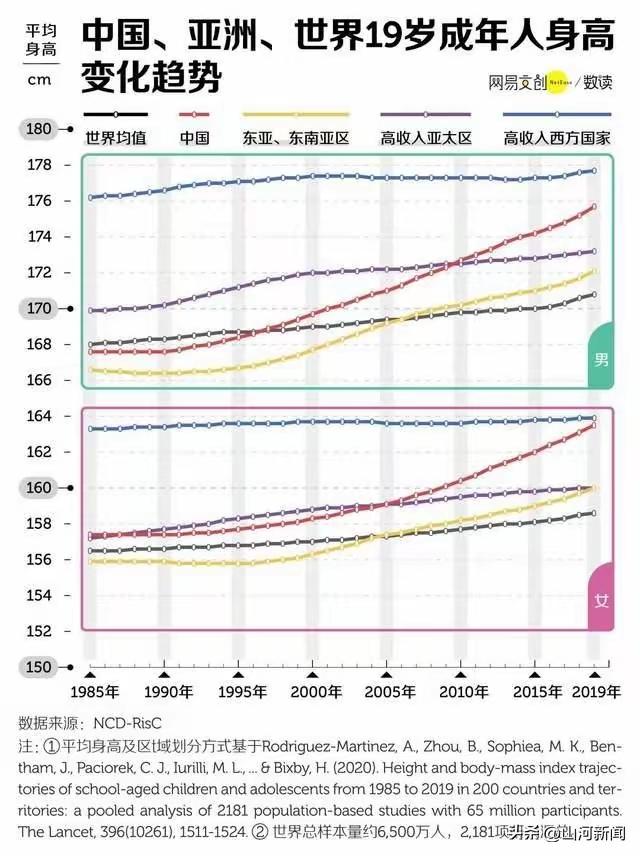 中国人的身高让西方感兴趣,原来外国人发现了一个秘密!   在很多人不注意的时候,中国青少年的身高已经悄悄“长到了”全球的舞台中央,英国《新政治家》、美国CNN都开始认真研究中国人的“身高密码”。   他们说:中国人长高了,不只是人长高了,背后的故事是整个社会的发展写在了身体上。   《柳叶刀》有一组数据:1985年到2019年,中国19岁男性平均身高整整涨了8.1厘米,是全球涨得最快的。   而19岁女性的身高涨幅也排到了全球前三,远超全球平均增幅。   而更让人惊掉下巴的是5岁小女孩这个群体:原本1985年时比美国同龄人矮了7厘米,到了2019年竟然反超过了2厘米!   2019年那会儿,中国19岁的男孩平均身高已经到了175.7厘米,女孩达到163.3厘米,多方数据显示有些地方的女生甚至接近163.5厘米了。   相比之下,虽然仍旧比荷兰男183.8厘米、女170.4厘米略矮,但人家的增长已经非常缓慢,而我们却是后来者居上,劲头十足。   1985年我国青少年的身高全球排名还在150名开外,短短三十多年,飙升到了65名,这跨度,简直像坐了高铁一样。 长高的原因最关键的,当然是吃得更好了,我国改革开放以后,家庭生活水平肉眼可见地提升。   1978年,人均粮食产量只有319公斤,到了2020年已经提高到474公斤,远超国际粮食安全线。   而同期人均肉、蛋、奶、水产品的摄入量翻了四到八倍,尤其是蛋白质摄入提高得非常显著,体现在身体上,就是基础营养水平大换代。   看看国家卫健委2020年的一份报告也能说明问题:18到44岁中国男性平均身高169.7厘米,女性是158厘米,和五年前比,男的多了1.2厘米,女的也多了0.8厘米。   6到17岁的青少年更是全面上涨,涨幅在1到1.6厘米之间,对于已经进入成长期的人来说,这是了不起的飞跃。   别以为这只是“吃得饱”的问题,事实上,今天中国几乎已经解决了广义上的营养不良问题,儿童的生长迟缓率已经降到7%以下,低体重率也控制在5%以内。   连此前困扰城乡的大病小病,如今都能及时得到治疗,从流行病防控到青少年生长发育干预,全国上下的公共卫生体系起到越来越大的作用。   过去那些因为饮水不洁、生病频繁耽误长个的老问题也被基本解决了。   有意思的是,这股子“民族整体长高”的趋势里,还有比较深层的代际因素,身高有基因影响是没错,科学界早就有定论,说70%左右是受遗传支配。   但中国的情况是,父母那一代,本身就比祖辈高不少。   比如60后、70后,生活条件比他们爸妈要好,现在90后、00后在爷爷奶奶的基因和爸妈改善环境的双重加持下,自然就比上一代更能长。   再加上现在青少年青春期发育延后,提前发育不再泛滥,骨骼发育周期更可控,这也是身高增长的一大因素。   不过,长得快,也有点隐忧,比如,现在我国面临一个很现实的问题:孩子们是高了,但也更“横向发展”了。   数据显示,我国6-17岁青少年超重和肥胖率已经突破20%,6岁以下儿童也接近10%,整体来看,全国18岁以上的成年人有一半人超标。   这可不是小问题,背后牵涉的是高热量饮食、外卖泛滥、运动不足这些生活方式的变化。   不客气地说,如果不加以干预,未来几年糖尿病、高血压等慢性病的患者可能会越来越年轻化。   所以对我们的孩子来说,长高只是第一步,接下来就不光是“高起来”,而是“强起来”。   全国很多学校已经开始不再只盯着身高标准,也更关注胸围、肺活量、背肌力量这类功能性指标。   换句话说,真正的健康体质,是结构合理的力量型成长,而不单纯靠数字。   英国《新政治家》曾用了一个挺有分量的比喻,说身高可以看作是一把“民生标尺”,“中国人的身高增长,是治理能力和经济模式成效的缩影”。   他们甚至借机分析了斯塔默访问中国的动作,呼吁英国别总拿老眼光看中国,而是要真心实意地加强合作。   CNN的声音也不一样了。他们不再讽刺某些社会政策,而是承认中国身高增长,正是“消除贫困取得进展的有形证据”。   与很多发展中国家在儿童营养方面长期停滞的情况对比,中国的成绩可不容小觑。   哈佛大学一项长期调查还透露过一个信号:超过九成中国受访者对国家治理表示满意。   而这种满意度,不是抽象概念,说实话,身高、健康、生活质量这些才是真正能感知到的“获得感”。   如果说身高是一面镜子,那中国正在通过这面镜子,向世界展示我们的社会进步。   看似平常的人体指标,背后是一代代人的努力,是千千万万民生政策的落地,是国家治理理念的升级。   而中国人骨子里那种不怕吃苦、一代更比一代强的精神,也正通过一厘米一厘米的增长,写在了身体上。   未来这个增长会慢下来,但故事才刚开始。