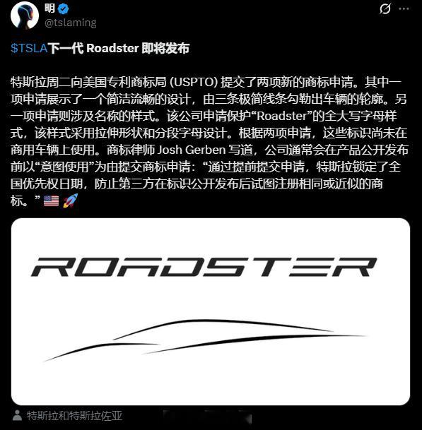 特斯拉 下一代 Roadster提交了两项新的商标申请,简洁还有未来感,有些期待