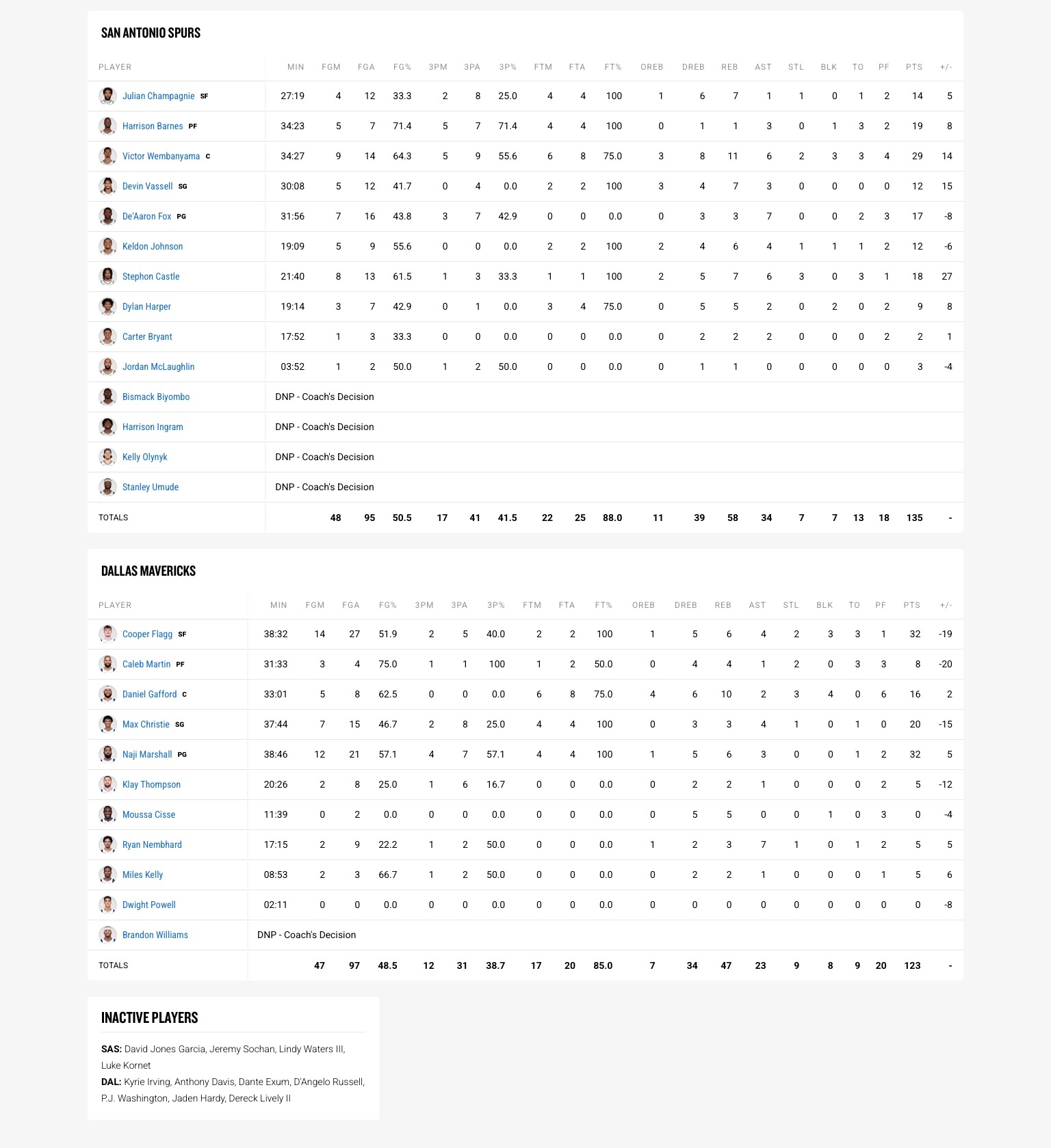 马刺(35-16):文班亚马29分11板6助2断3帽、巴恩斯19分1板3助、卡斯尔18分7板6助3断、福克斯17分3板7助、尚帕尼14分7板1助、瓦塞尔12分7板3助、凯尔登12分6板4助、哈珀9分5板2助2帽、麦克劳林3分1板、布莱恩特2分2板2助。