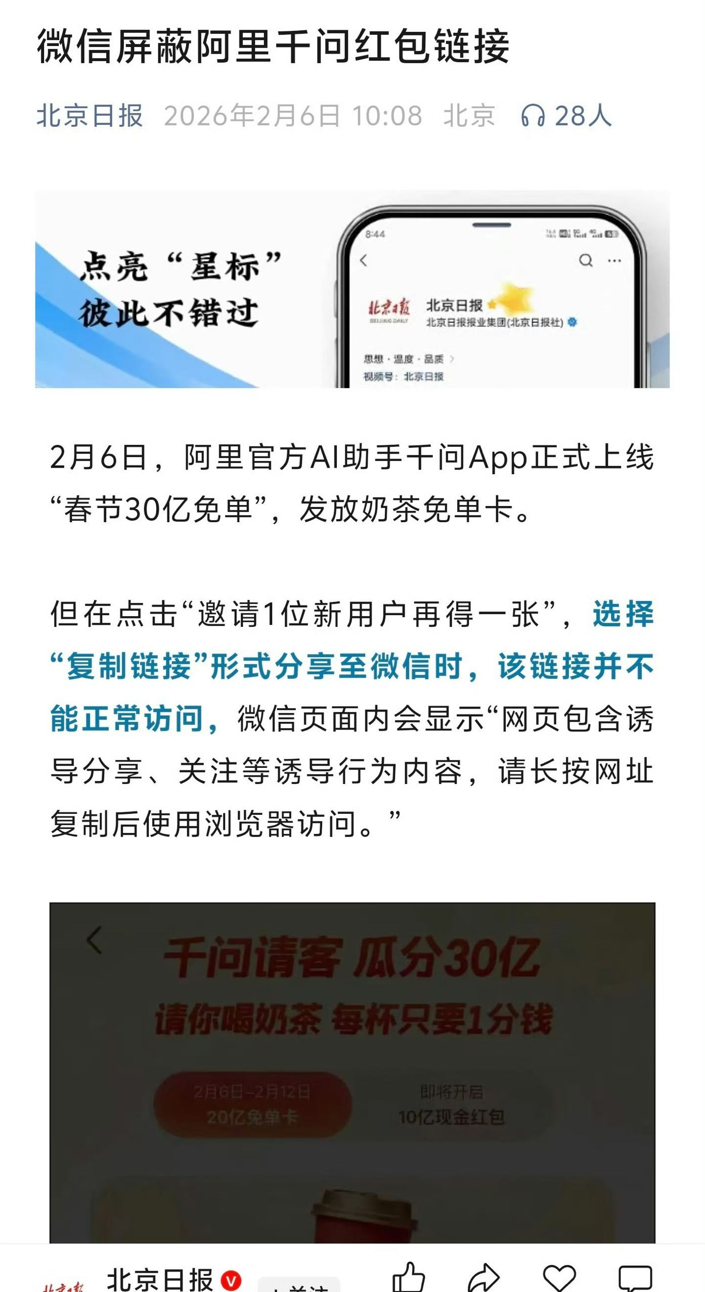 先是发红包后是喝奶茶,刚刚出门吃饭大家全在聊,还好活动2月底前都能用页面卡住不动的话多发几次就好了,你们都薅到了吗?千问回应免费奶茶活动