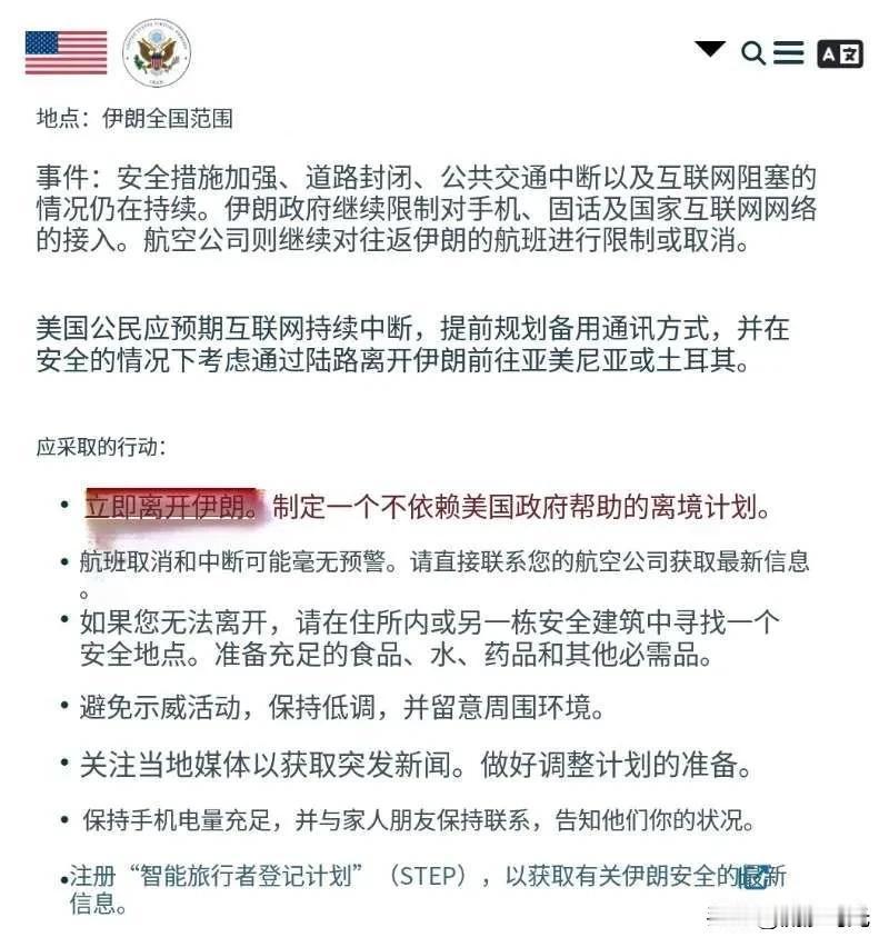美国国务院呼吁美国公民立即离开伊朗,伊朗全国范围事件: 安全措施加强、道路封闭、公共交通中断以及互联网阻塞的情况仍在持续。伊朗政府继续限制对手机、固话及国家互联网网络的接入。航空公司则继续对往返伊朗的航班进行限制或取消。美国公民应预期互联网持续中断,提前规划备用通讯方式,并在安全的情况下考虑通过陆路离开伊朗前往亚美尼亚或土耳其。应采取的行动:立即离开伊朗。制定一个不依赖美国政府帮助的离境计划。•航班取消和中断可能毫无预警。请直接联系您的航空公司获取最新信息•如果您无法离开,请在住所内或另一栋安全建筑中寻找一个安全地点。准备充足的食品、水、药品和其他必需品。•避免示威活动,保持低调,并留意周围环境。•关注当地媒体以获取突发新闻。做好调整计划的准备。•保持手机电量充足,并与家人朋友保持联系,告知他们你的状况。•注册“智能旅行者登记计划”(STEP),以获取有关伊朗安全的最新信息。