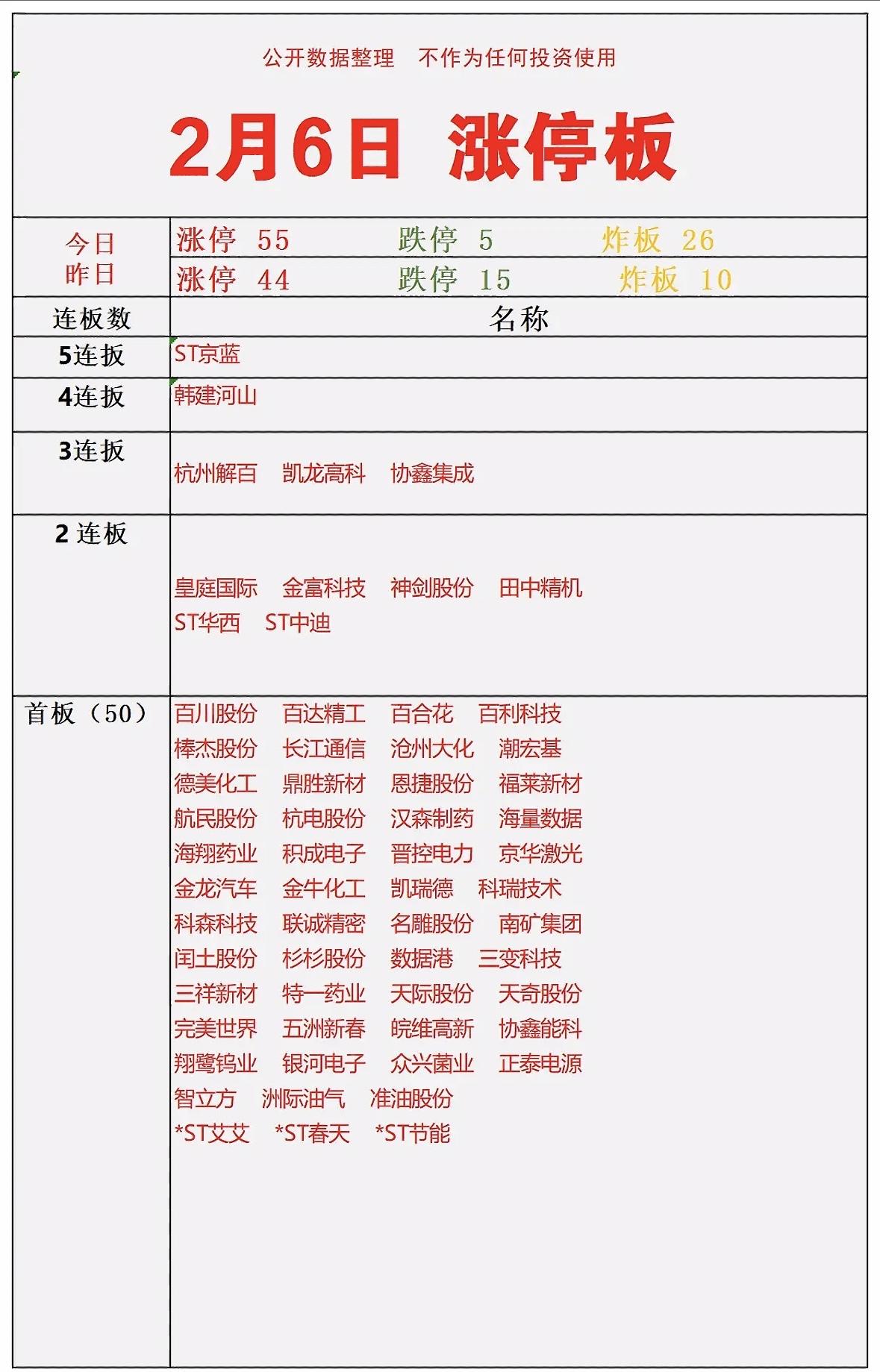 2月6日涨停板数据:哪些股票强势涨停? 涨停潮延续,京蓝五连板领涨,多股跟风。