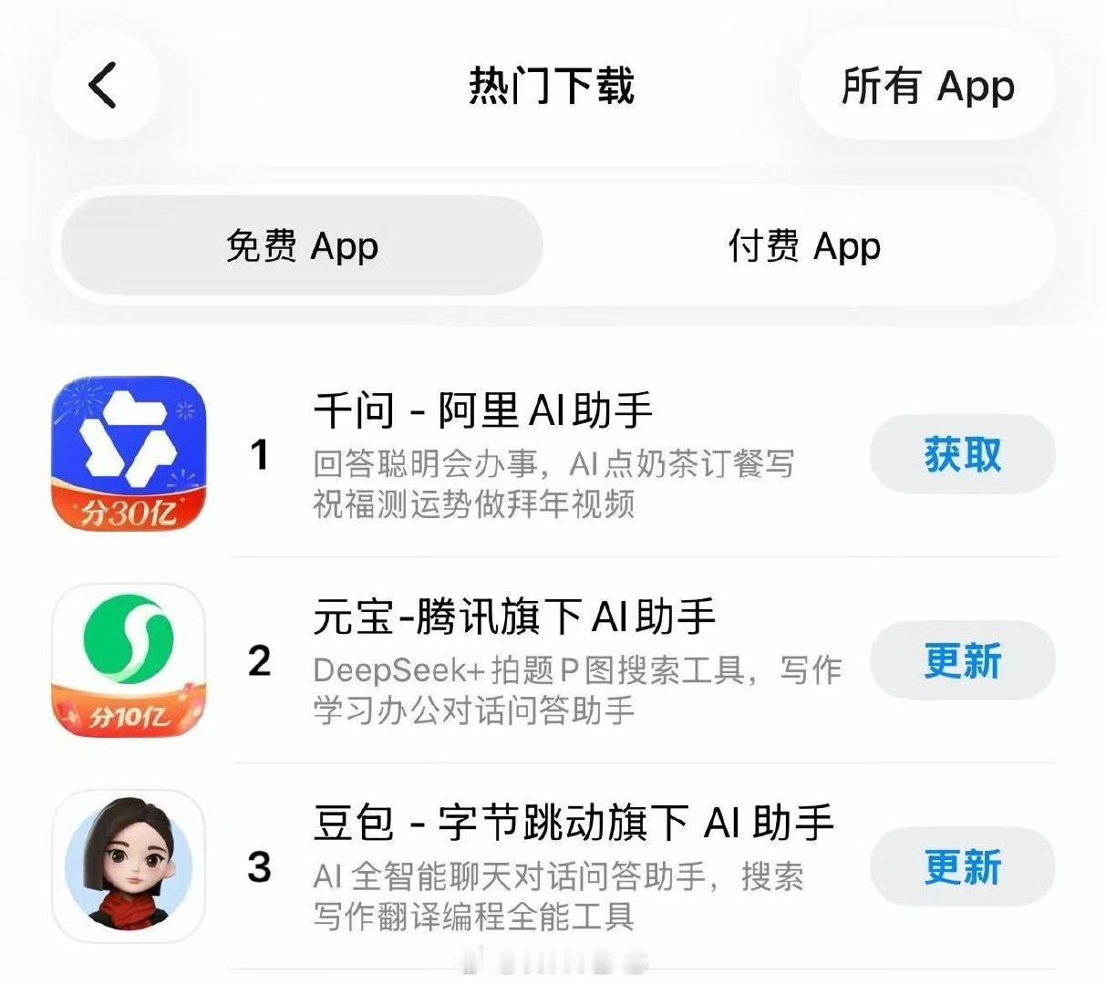 千问登顶AppStore免费榜第一前三都是 AI 大模型,千问、元宝、豆包,这种朴实无华的 AI 大战多来点才有意思。