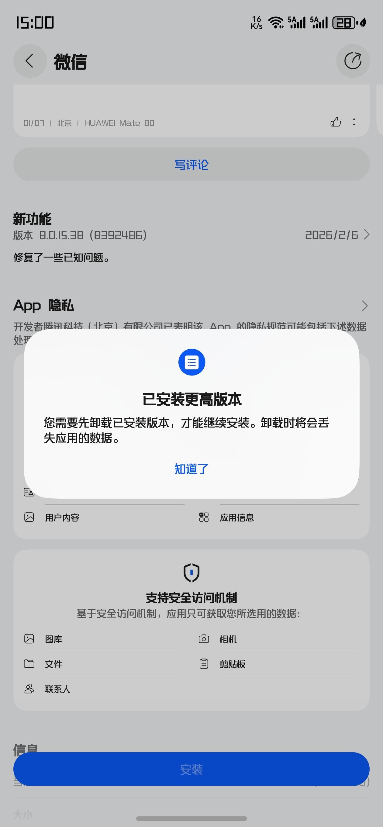 鸿蒙6.0微信正式版来了8.0.15.38是正式版,我准备安装发现我的版本号太高了,原来正式版没出来,就开始内测了,这速度是真快,手表登录不管是正式版还是内测还是不能登录,只有一小部分朋友热更能用,相机也是小部分测试,目前我还是系统相机,手表也不能登录[捂脸]