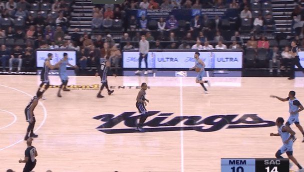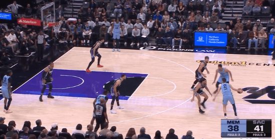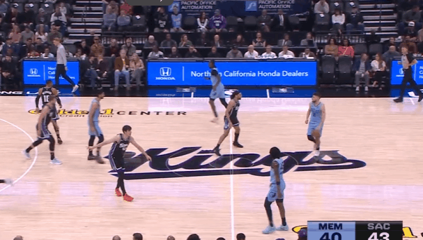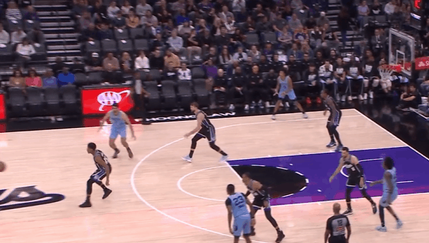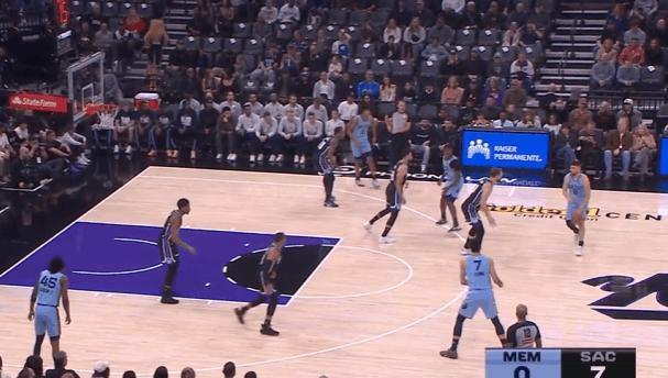 P6灰熊抢发底线球,杰罗姆中线位置接球后快速推进至前场,直接急停拔起出手超远持球追身三分,打国王防守立足未稳。