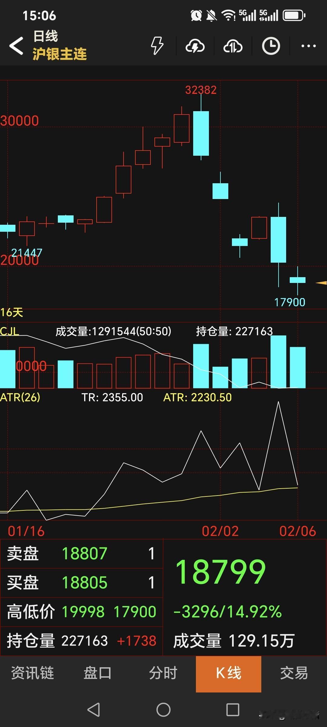 伴随着外盘银价的暴跌, 周五国内白银期货 继续大幅回落。 主力合约收盘于18799元, 较上一日下跌3296元, 盘中最低跌至17900元, 不但接近跌停价, 也是本周最低价。 对于白银期货, 期货小褚建议大家 观望为主,不要参与!