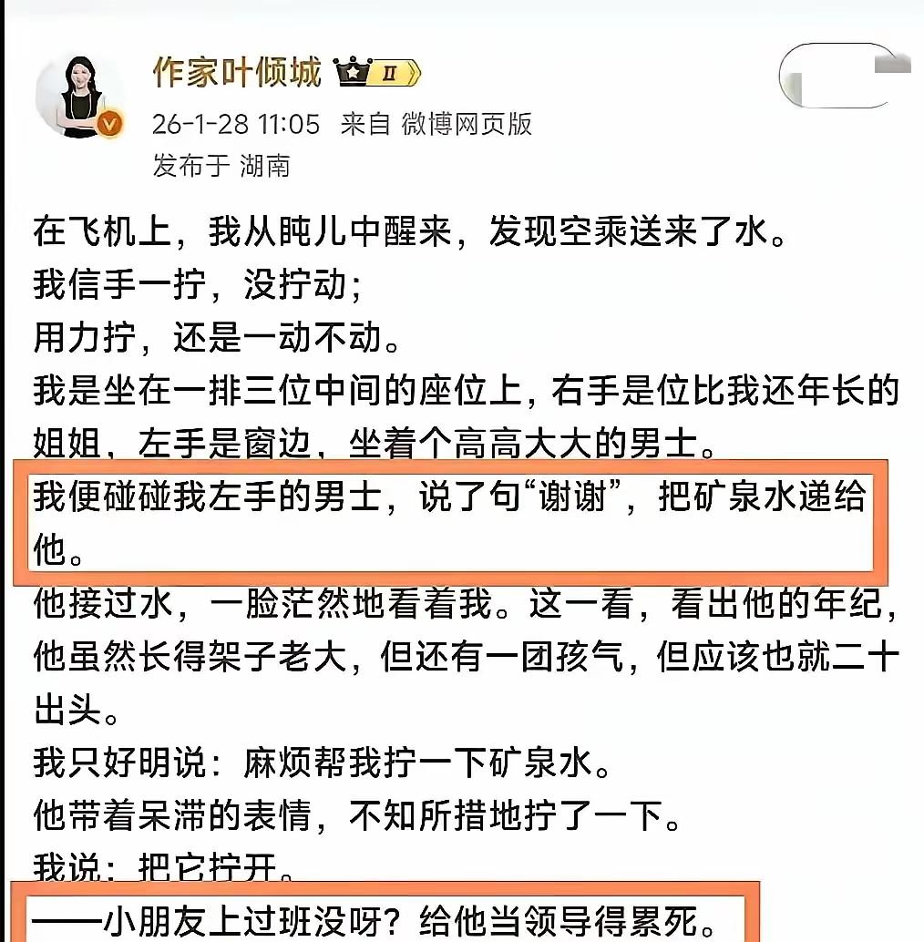 不是,她是不是起了个倾城的名字,就以为自己倾城倾国了?这是病,得治。 武汉作家叶倾城?这一下子让我想到了方方,她俩应该认识吧。 虽然说你长的确实老态龙钟,但你的年龄确实还没有老的连个瓶盖都拧不开吧。 好吧,就算真拧不开,可以请求机组服务人员啊,人家小伙子没有义务替你拧。 结果呢,人家小伙还是给你拧开了,但你还嫌弃慢了,在网上蛐蛐人家。 心疼那个小伙,坐一趟飞机竟然有了这么大的心理阴影。