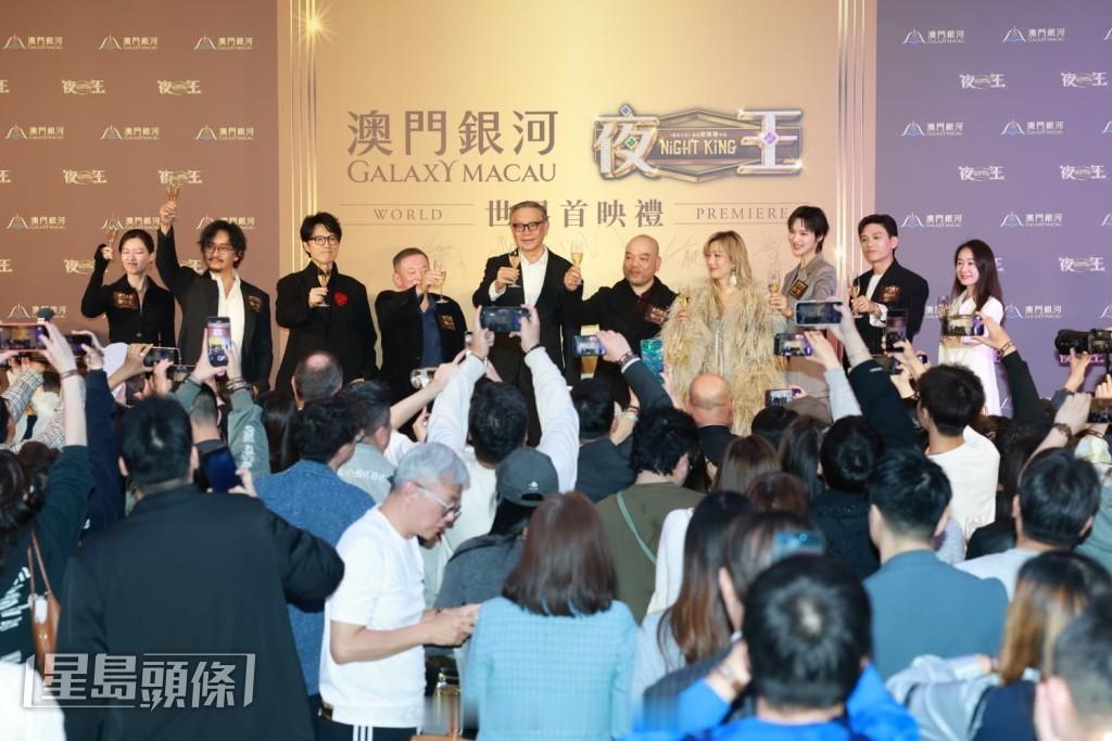 贺岁片《夜王》昨晚(5日)于澳门举行世界首映礼,黄子华、郑秀文、谢君豪、廖子妤、卢镇业和王丹妮等都有出席。黄子华在活动上笑指在赌场戏院宣传似玩百家乐,后面一大堆人一起叫开“大”,并邀请现场嘉宾一齐大叫“大”,全场附和,即令他说:“现在对这戏充满信心!”