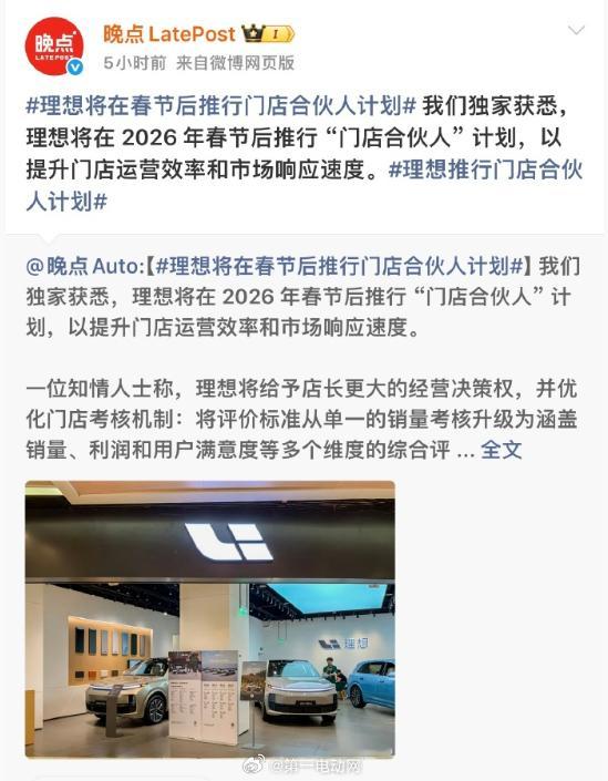 有消息称,理想汽车春节后推“门店合伙人”计划,赋予店长更大的经营决策权全新一代理