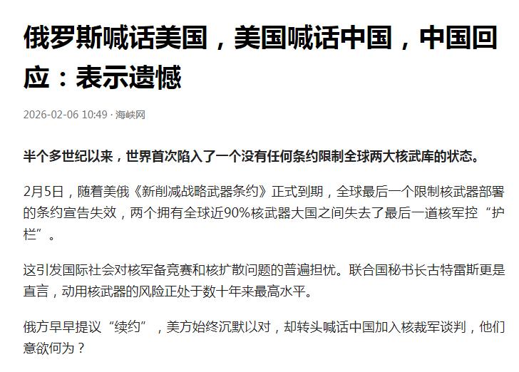 《新削减战略武器条约》到期不续签,上三常玩的这是什么? 俄罗斯对美国喊话,赶快签吧。 美国对中国喊话,你也加入吧。 中国说,你们玩,我没空。 本来也是嘛,我们又没有你们两家那么多核武器,我们参加什么核裁军? 要不等我们发展到和你们一样多的时候再来讨论这个问题。 没有这个条约危险吗? 条约本来就是用来撕毁的,所以淡定。 只要我们自己手中有剑,就什么也不怕。 点右上角关注我,我们一起去看这个魔幻的世界