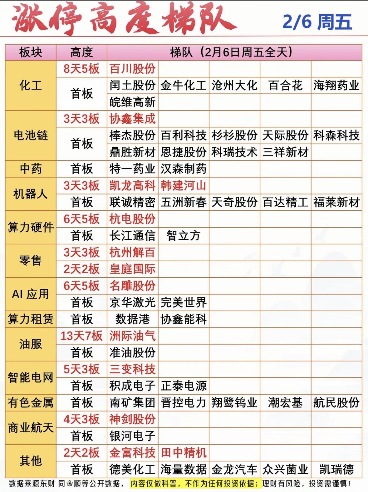 2月6日涨停板梯队分析,带你领略涨停板的精彩! 股市热点轮动,化工、算力、零售等板块活跃,多股涨停。投资需谨慎,风险自担。