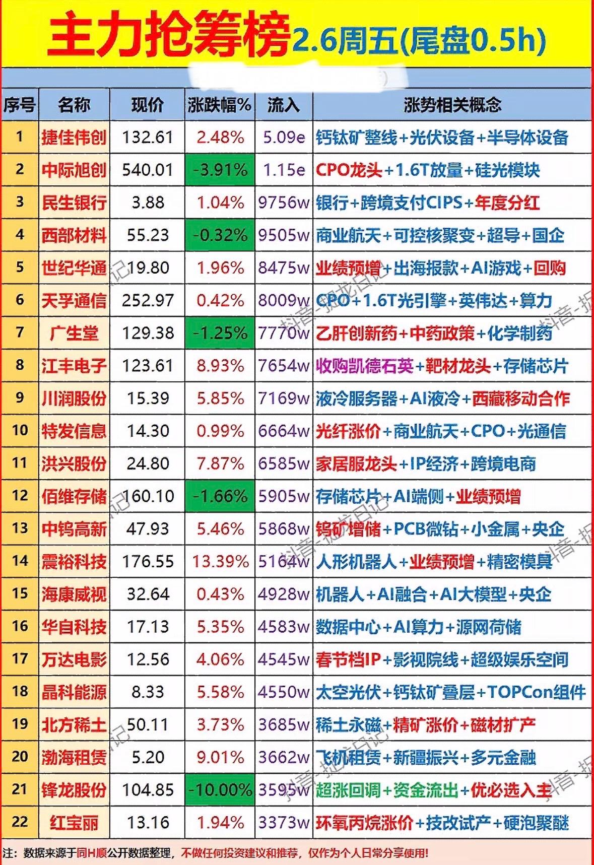 主力抢筹榜2.6周五,尾盘0.5h,强势概念股揭秘! 主力抢筹榜聚焦光伏、半导体、AI等热门赛道,钙钛矿、CPO、存储芯片概念股受资金青睐,银行与稀土板块亦有表现。