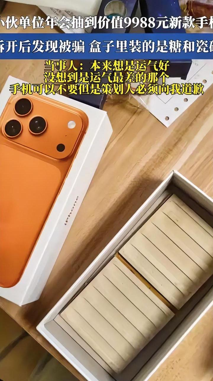 玩不起还玩,年会戏耍员工智商,抽奖中苹果手机,结果给了个装瓷砖的手机盒。 广东某单位近期大搞年会,现场一小伙子被抽中苹果手机,价值9988元,小伙子兴奋不已,拿着沉甸甸的手机高兴回家了。 结果到家一打开,发现手机盒里有几块糖,还有两块瓷砖。可能是怕重量不对,所以放瓷砖配重,假装的像一些。 小伙子感觉智商受到侮辱,一气之下发视频到网上,控诉单位“玩不起”。 也确实让人无语,送不起就不要搞抽奖,员工辛辛苦苦一年,结果到头还要被耍一通。 单位这一操作,丝毫没看出娱乐性,反而把抠门和业余展现的淋漓尽致,连员工都欺骗的单位,诚信是个大问题。