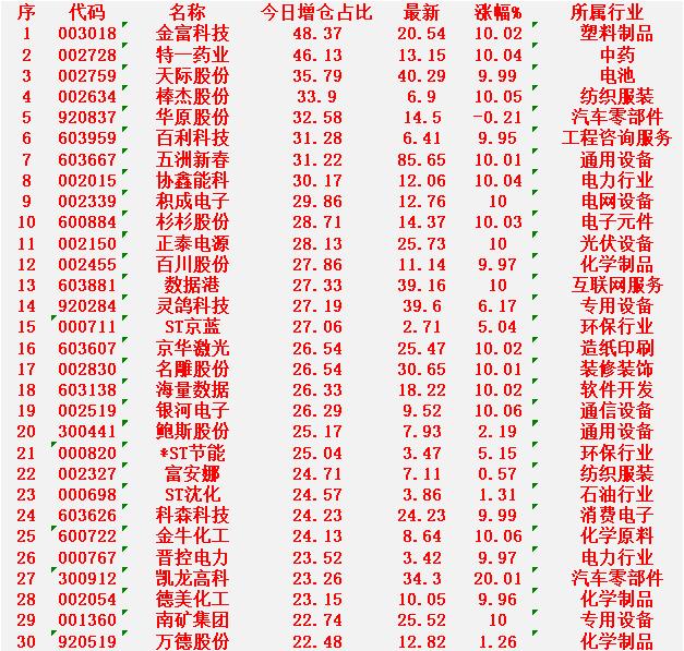 2月6日,增仓占比最多的30名单汇总一览 金富科技:今日增仓占比 48.37%,最新价 20.54元 特一药业:今日增仓占比 46.13%,最新价 13.15元 天际股份:今日增仓占比 35.79%,最新价 40.29元 棒杰股份:今日增仓占比 33.90%,最新价 6.90元 华原股份:今日增仓占比 32.58%,最新价 14.50元 百利科技:今日增仓占比 31.28%,最新价 6.41元 五洲新春:今日增仓占比 31.22%,最新价 85.65元 协鑫能科:今日增仓占比 30.17%,最新价 12.06元 积成电子:今日增仓占比 29.86%,最新价 12.76元 杉杉股份:今日增仓占比 28.71%,最新价 14.37元