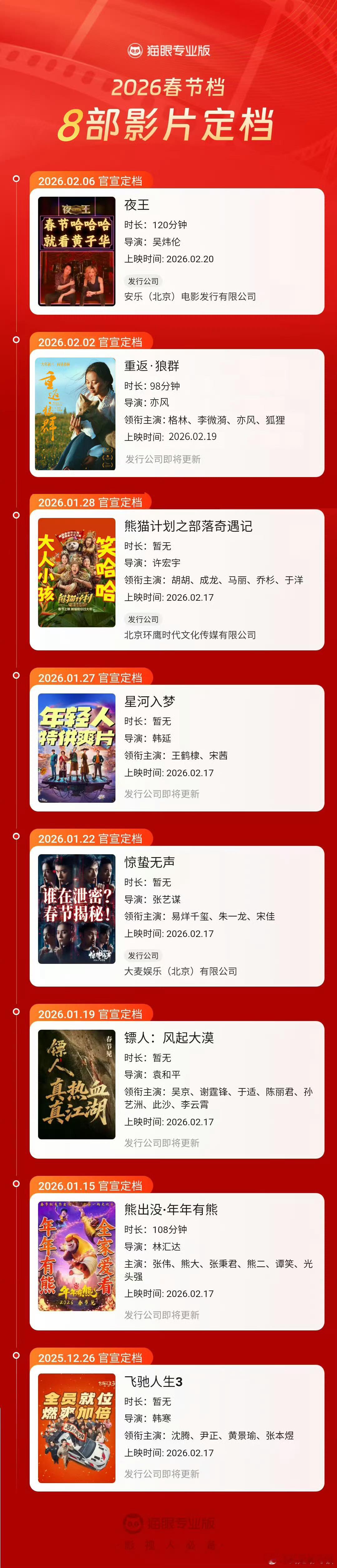 神仙打架官宣!猫眼专业版显示2026春节档已有8部影片正式定档,题材全覆盖、阵容超豪华,史上最长春节档观影清单码住:《飞驰人生3》《惊蛰无声》《镖人:风起大漠》《熊出没·年年有熊》《星河入梦》《熊猫计划之部落奇遇记》《重返·狼群》《夜王》
