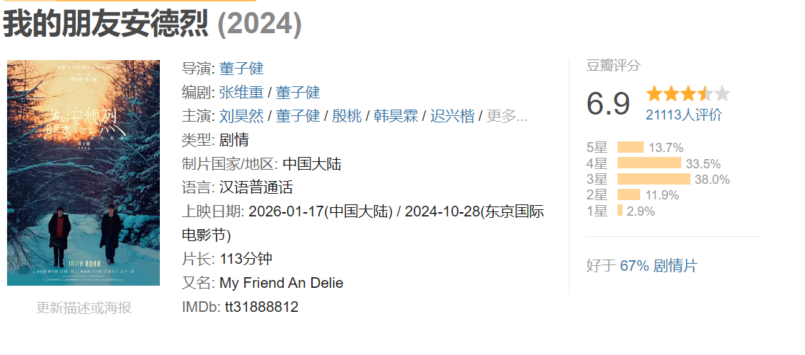 我的朋友安德烈又涨分了 刷到董子健导演、刘昊然主演的我的朋友安德烈豆瓣评分又上涨,直观感受到了有越来越多的人看懂这部好电影了~豆瓣能涨分已经很少见了,电影我的朋友安德烈能实现连续涨分,这是靠每一个走出影院的观众用观影感受积累出的口碑。好作品值得被更多人看见!还没有去影院看的人真的可以尝试一下