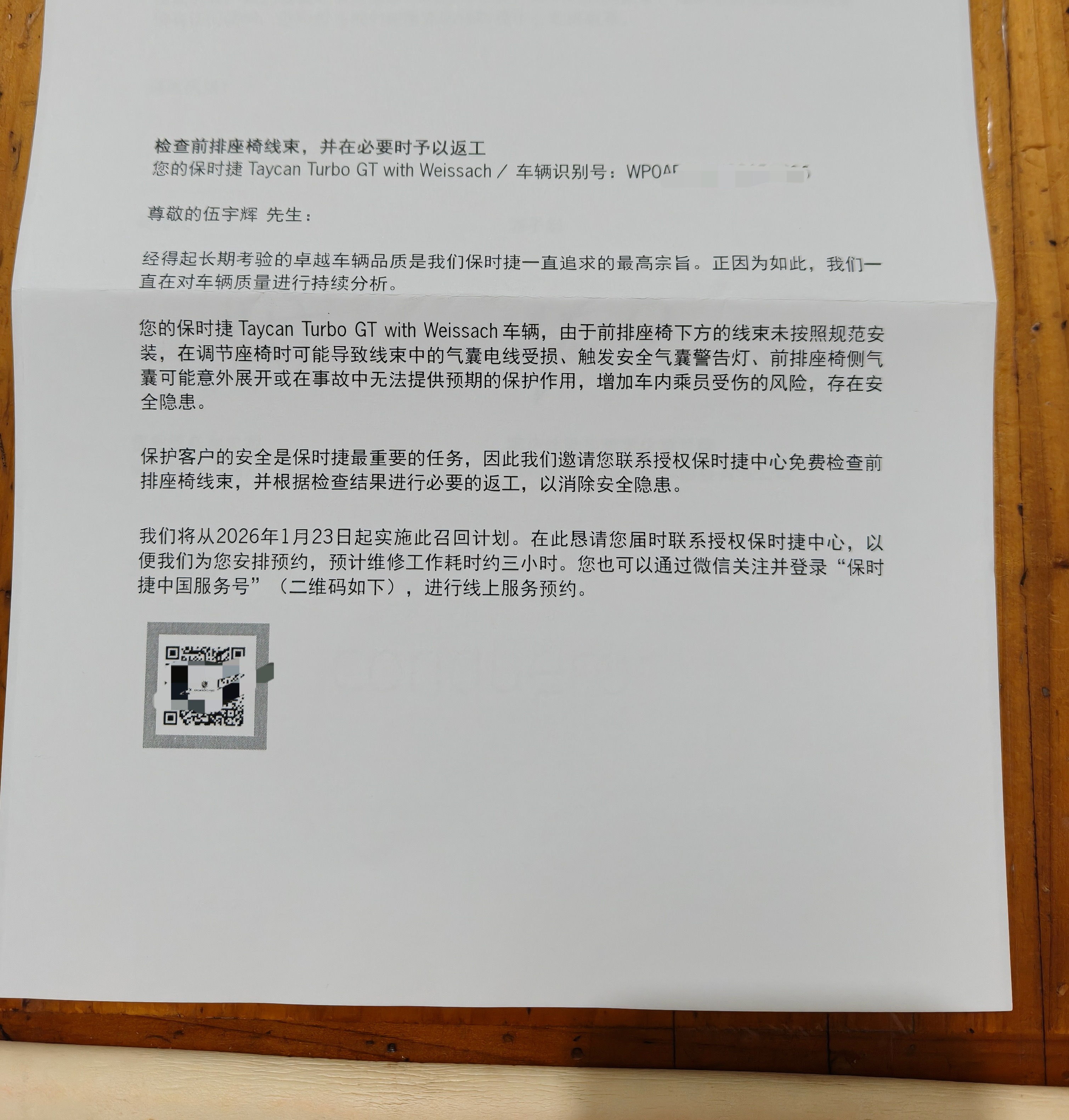 老母亲说收到一封来自保时捷的召回信,说 Taycan TGT 座椅线没装好, 有隐患