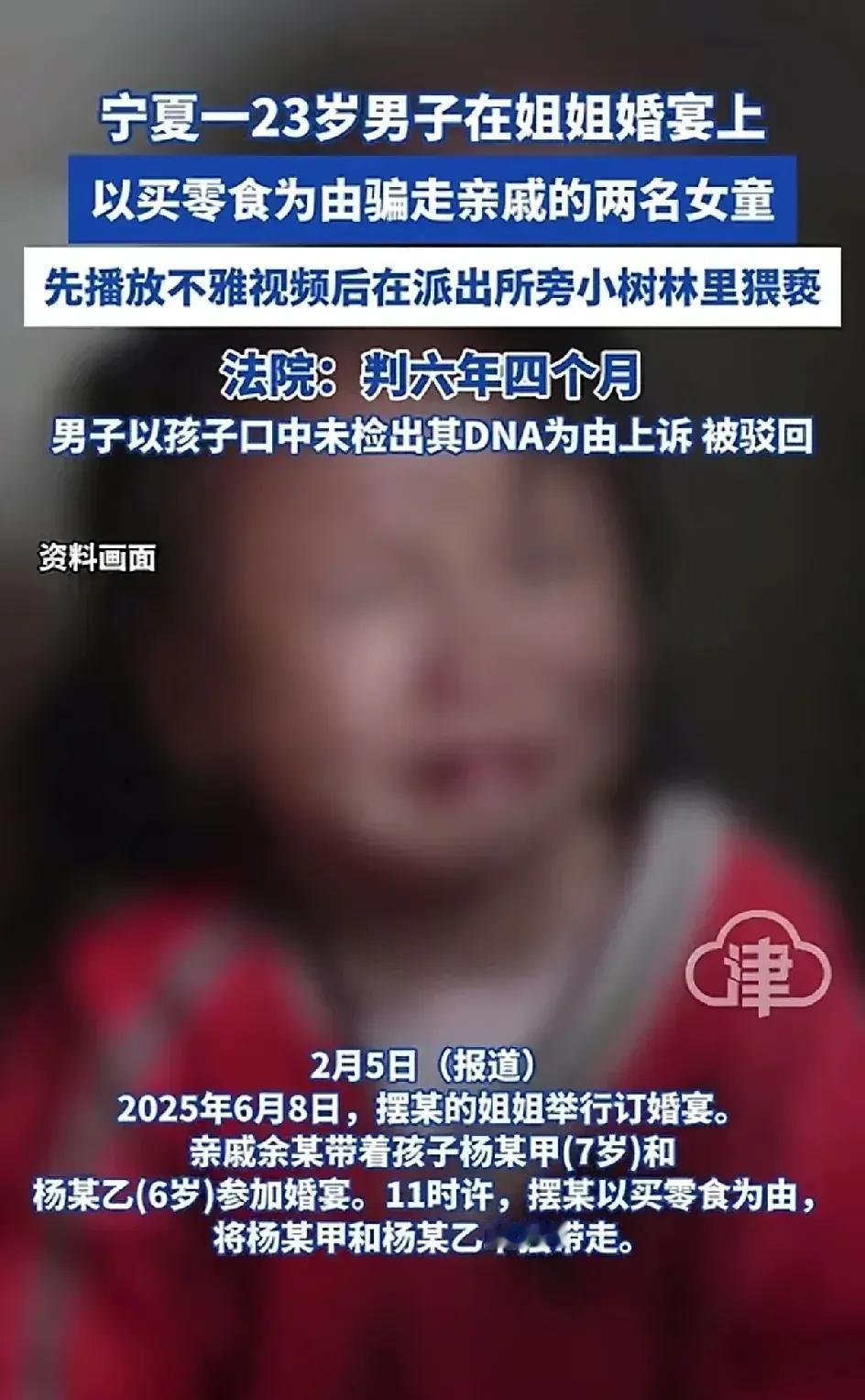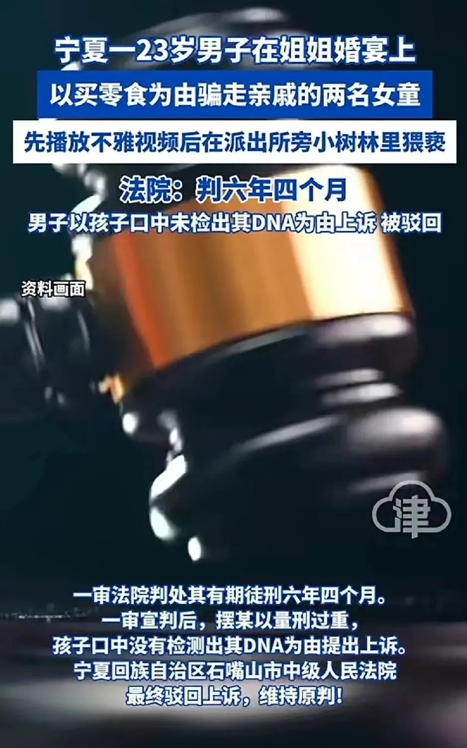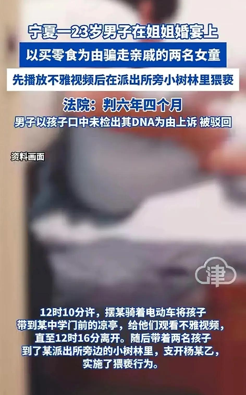 宁夏一23岁的男子在姐姐的婚宴上,哄骗亲戚家的两个小女孩。(一个6岁,一个7岁,姐妹俩)。以买零食为由,把她们带到树林里,对7岁的小女孩猥亵。事后小女孩的妈妈看到女儿不停的吐口水,觉得异常,再三询问后,女孩描述了当时的情景。她妈妈报了警,男子被抓,判6年四个月。这个男的连姐姐都连累了,发生这样不好的事情,姐姐的名声在姐夫家里都有很大影响。