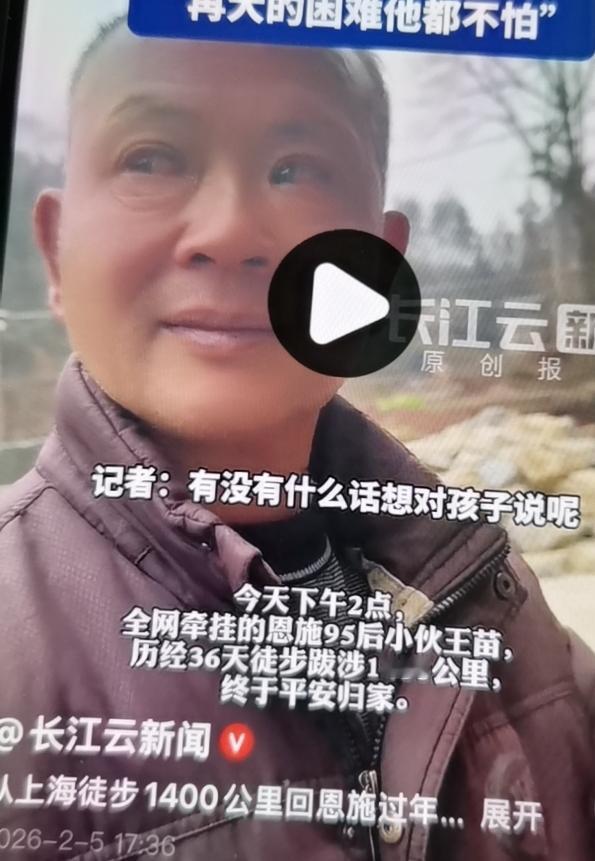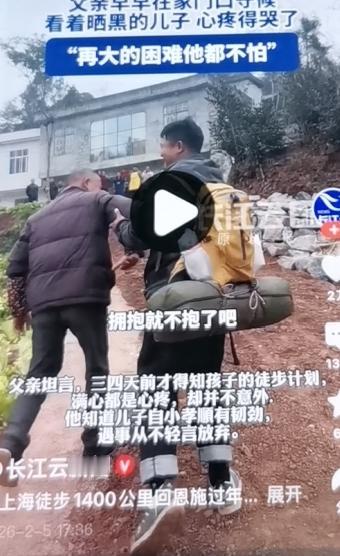徒步从上海到湖北恩施1400公里,95后小伙王苗用了36天终于平安到家! 父亲早早在家门口等候,看着晒黑的儿子心疼哭了! 记者问有什么话对儿子说吗? 王苗父亲一边擦着眼泪一边笑着说,没得话说! 王苗到了路口,父亲亲自迎接,挽着儿子的手! 他知道儿子从小孝顺有韧劲,遇事从不轻言放弃!三四天前才知道儿子的徒步计划! 王苗身上装着简单的装备 有网友说不知道穿破几双鞋子才能到达! 万千网友都佩服这种坚韧不拔的毅力,值得点赞 真是验了读万卷书,行万里路