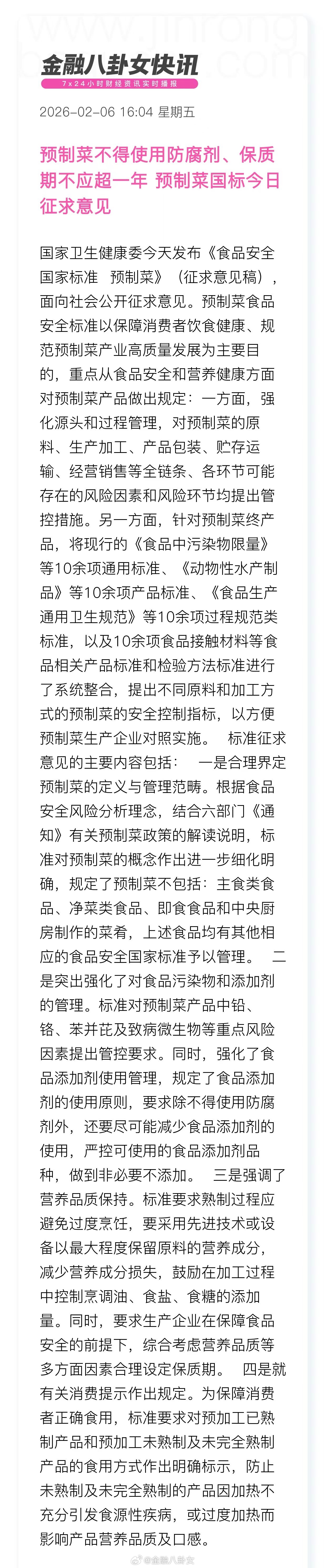 预制菜不得使用防腐剂、保质期不应超一年 预制菜国标今日征求意见预制菜国标征求意见