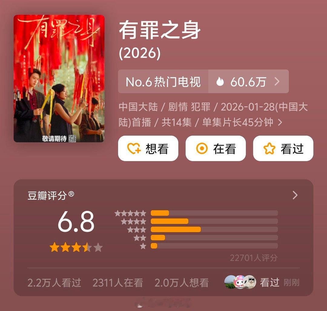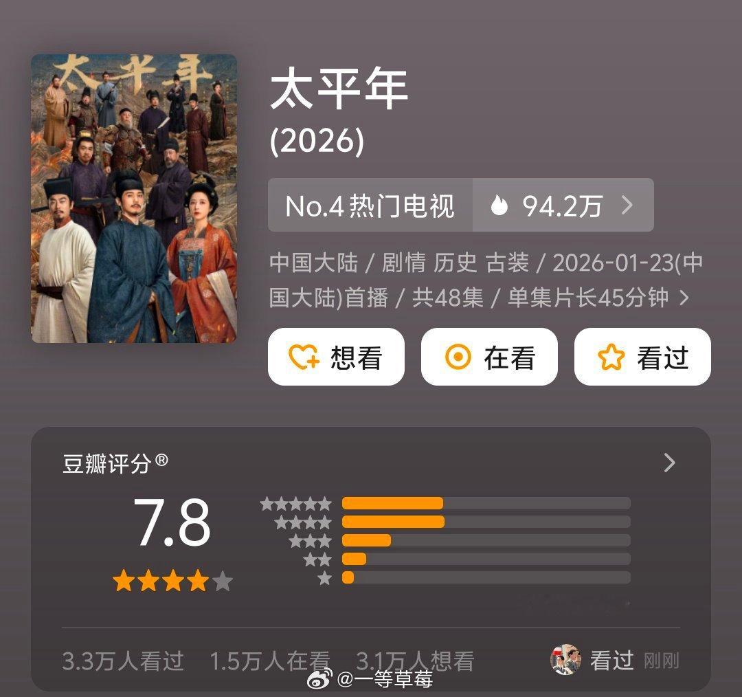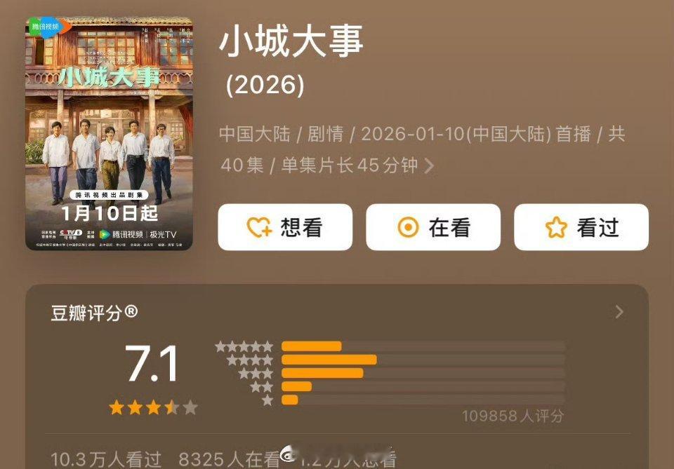 赵丽颖、黄晓明《小城大事》开分7.1魏大勋、孙千《有罪之身》开分6.8 白宇、周雨彤《太平年》开分7.8