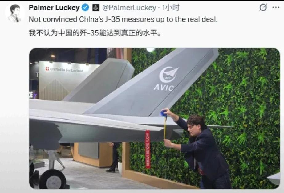 2026年2月6日新加坡航展上,被中国制裁的美国安杜里尔军火公司老板帕尔默·拉基,竟偷偷摸摸用卷尺测量歼 - 35战斗机模型。他还嘴硬称歼 - 35抄袭F - 35,还不信歼 - 35能达到真正水平。这就很搞笑了,且不说拿着卷尺量能有啥用,就算给真机,那误差数据也没法用。 美国安杜里尔公司因向台军出售无人机等技术被制裁,像台当局生产的梭鱼 - 500廉价巡航导弹就出自该公司。美国不敢承认歼 - 35比F - 35强,只能酸言酸语,只能说他们这度量也就这样了。