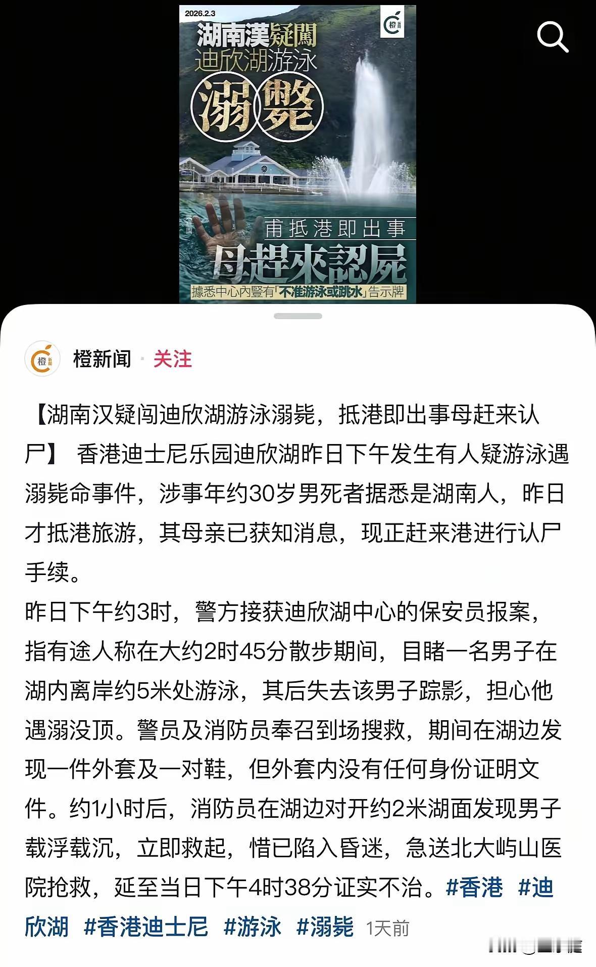 湖南一青年男子2月2日到达香港迪士尼乐园,下午2点他就到迪欣湖里游泳,大约3点钟岸上人员不见了游泳者马上向保安说明情况,保安立即进行了救援,将男子救到岸上送医院抢救,可惜人没到医院就去世了,冬天水太凉了根本不适合游泳,目前他的父母赴港处理后事。