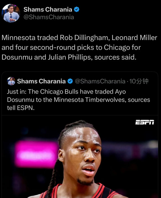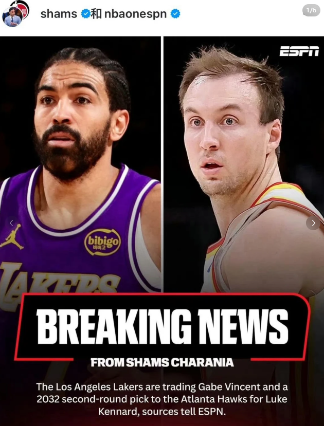 NBA交易市场再起波澜,湖人、老鹰、森林狼与公牛先后完成两笔引人瞩目的交易! 湖人老鹰交易:神射手驰援,各取所需 根据ESPN名记Shams Charania报道,湖人将后卫盖布文森特(Gabe Vincent)和一枚2032年的次轮选秀权送至老鹰,换回神射手卢克肯纳德(Luke Kennard)。这是一笔典型的“各取所需”的2换1操作。 湖人为何出手? 湖人本赛季外线投射乏力的问题始终未解,而文森特在加盟湖人后的表现远未达到预期。本赛季他出战29场比赛,场均仅得到4.8分、0.9个篮板和1.3次助攻! 肯纳德能带来什么? 肯纳德正是湖人急需的顶级外线火力点。本赛季他场均能贡献7.9分、2.2个篮板和2.1次助攻,更重要的是,他拥有高达49.7%的恐怖三分命中率。他生涯三分命中率高达43.2%,是联盟最顶级的空间点之一。 文森特对老鹰有何帮助? 对老鹰而言,肯纳德是一份即将到期的1100万美元合同。交易后,老鹰不仅获得了一个未来的次轮签作为资产,还创造了一个价值约1100万美元的交易特例,为后续操作留下了灵活性。文森特作为一名经验丰富的后卫,可以作为老鹰的可靠替补,提供老鹰第二阵容所欠缺的防守韧性和组织能力。 森林狼公牛交易:后场升级,深度补强 几乎在同一时间,森林狼与公牛也达成了一笔规模更大的交易。森林狼送出年轻后卫罗伯特迪林厄姆(Rob Dillingham)、前锋莱昂纳德米勒(Leonard Miller)以及四个未来的次轮选秀权,从公牛换回后卫阿约多森姆(Ayo Dosunmu)和锋线朱利安菲利普斯(Julian Phillips)。 森林狼的补强逻辑 森林狼本赛季志在冲冠,但后卫线的深度和进攻火力一直是隐忧。这笔交易表明,他们愿意牺牲部分未来资产,换取即战力的显著提升。 多森姆:即插即用的后场答案 多森姆是这笔交易的核心。本赛季他为公牛出战45场,在26.3分钟的场均时间内,高效贡献15.0分、3.0个篮板和3.6次助攻。他的投篮命中率达到51.4%,三分命中率更是高达45.1%,罚球也有85.7%的命中率。这样一位能投能传、效率极高的双能卫,将完美补充森林狼的后场。 菲利普斯:值得培养的潜力股 朱利安菲利普斯则是一张值得期待的“彩票”。这位22岁的锋线身高202cm,本赛季场均出战9.3分钟,得到2.6分和1.3个篮板。他运动能力出色,防守端有潜力成为“3D”型球员。