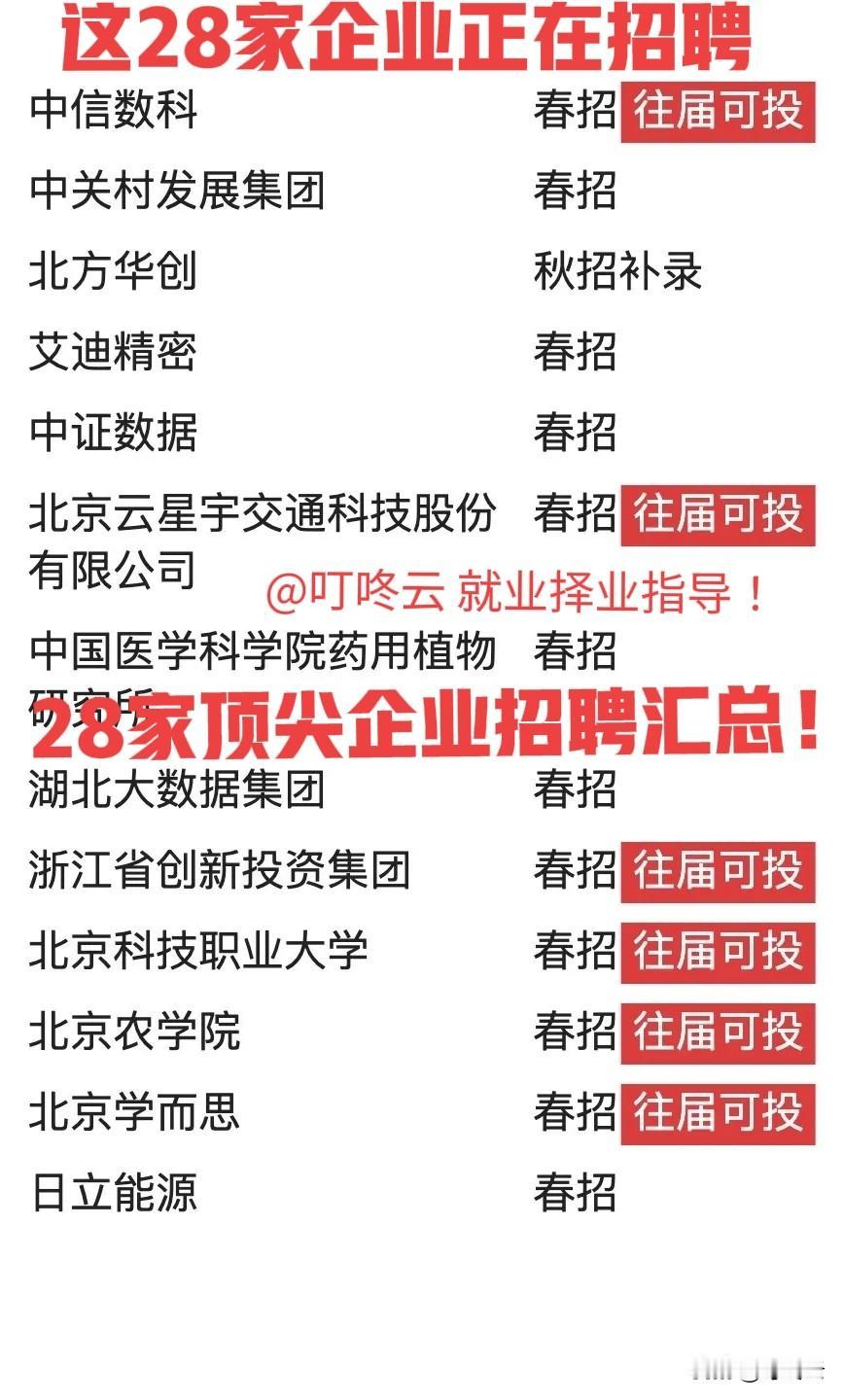 往届生能报!盘点最新28家头部企业正在招聘汇总!应届生都可以报名,13家企业往届生报名!超多好岗等着你,速速收藏起来备用!本文包括中信数科、中关村发展集团、北方华创、中国电科32所等28家顶尖企业招聘汇总合集!大鹏一日同风起,扶摇直上九万里!速速围观揭秘详细内容![点亮平安灯][点亮平安灯][烟花][烟花] 招聘往届生的国企有哪些 欢迎关注@叮咚云 将优先为粉丝职业规划指导,为你定制最适合的就业择业方案!欢迎留言交流讨论。[来看我][来看我] 免责声明:图片来自网络,仅供参考! 国企校招应届生 春招招聘岗位