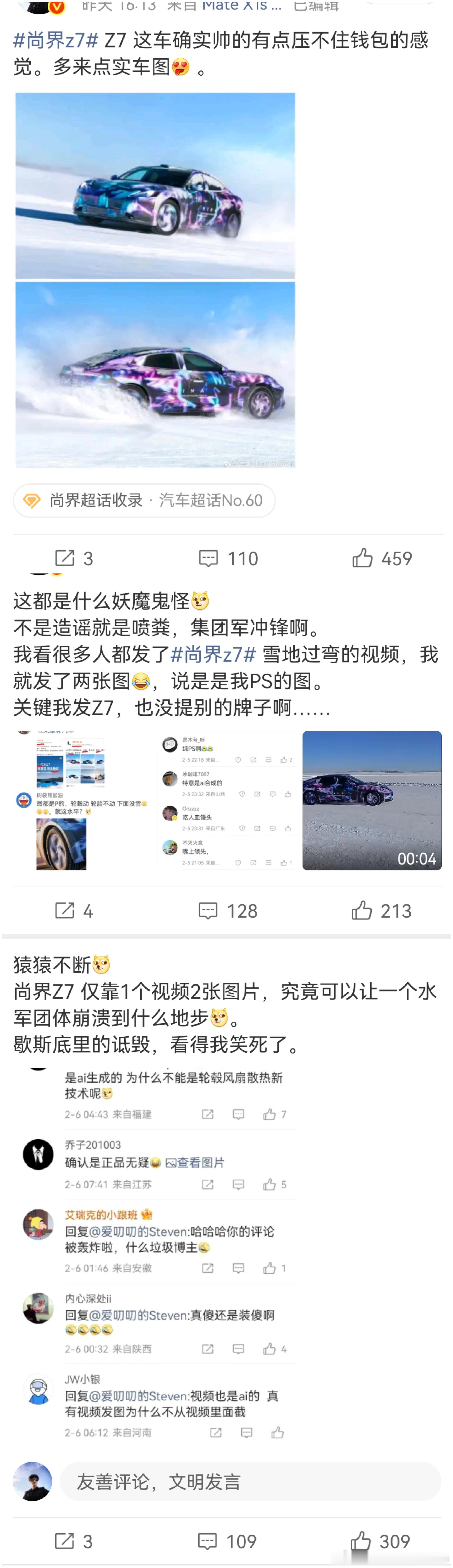 我寻思我发的这3条微博也没提别的品牌啊你们这帮水军别试图制造品牌对立,我从到尾都是在夸尚界Z7很好看,我觉得有水军在抹黑尚界Z7。现在看来有组织的蓄意抹黑尚界Z7看来是事实。