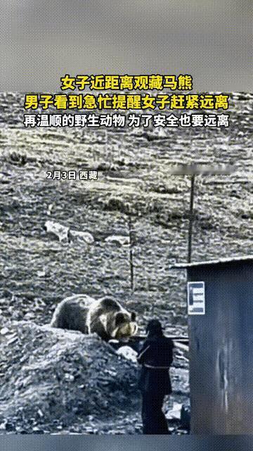 傻女人胆子真大!2月3日西藏这事儿真给我看傻了!一个年轻姑娘居然凑到5米内看野生藏马熊找吃的,还敢拍照!当地人见了藏马熊都躲着走,这姐们儿倒好,跟看宠物似的,一脸平静。 还好路过大哥小声提醒她慢慢转身别跑,结果这姑娘跟好奇宝宝似的,不紧不慢走开,中途还回头瞅了一眼!真就不知死活啊!藏马熊没动真的是运气好,但凡它有点异动,后果不堪设想。 这胆子也太大了,说好听点是天真可爱,说难听点就是傻!野生猛兽哪能这么近距离凑?真替她捏把汗,希望以后别再这么鲁莽了!