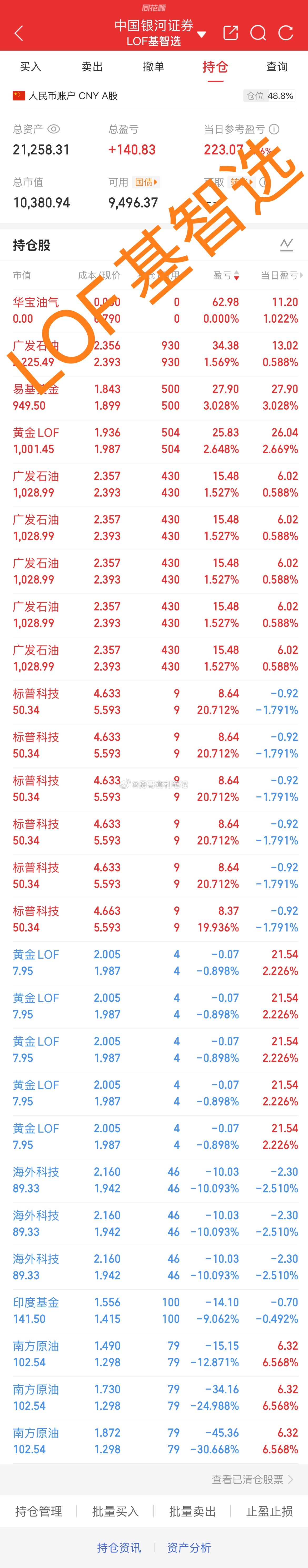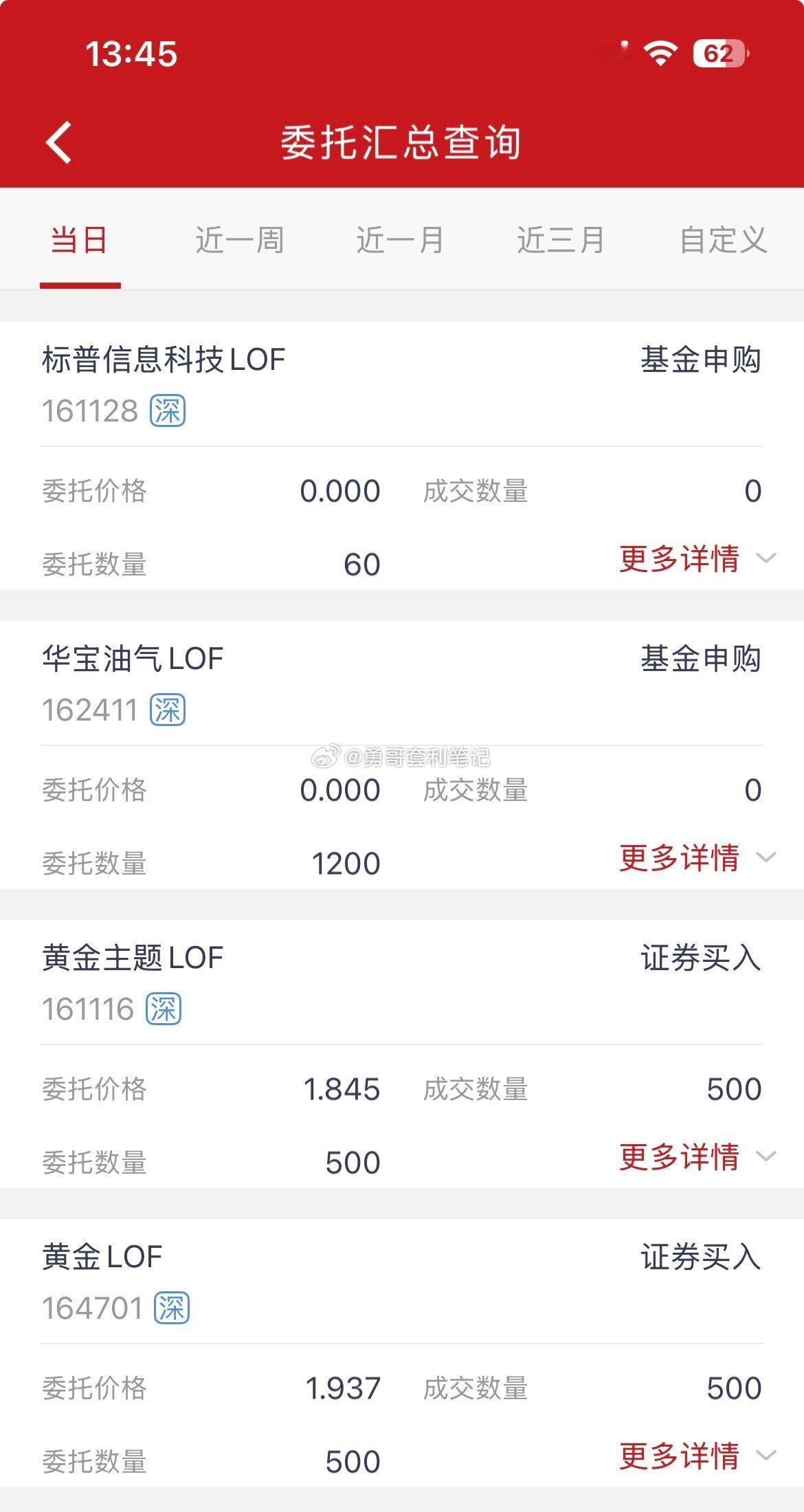 套利 今天申购两只,分别是标普信息科技161128溢价率3%+,限额10,攒几天一块卖。华宝油气162411溢价率2%+,限额200,我是昨天买了,是属于底仓套利,正好场内卖出1100,申购1200,无底仓不建议参与,原油波动大风险高。仅供参考,抄作业有风险,套利需谨慎,所有申购盘中跳水,溢价率抹平或大幅缩小将撤单!实盘贴图仅作为个人记录之用,不构成任何投资建议及操作指引!盈亏自负,切勿盲目跟风!