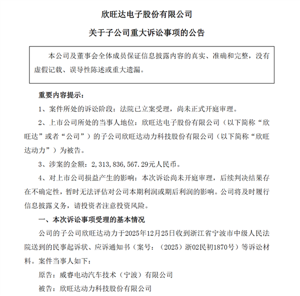 遭起诉被索赔23亿后欣旺达与吉利子公司威睿和解