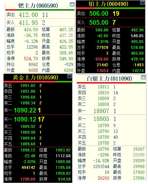 2月6日, 国内再度遭遇黑色星期五, 贵金属四大品种齐刷刷下跌, 白银期货更是接近跌停。 通过下图的数据,可以明显看出: 黄金主力合约收盘于1090.12元,下跌2.02%; 白银主力合约收盘于18799元,下跌14.92%; 广期所的钯金主力收盘于41.5元,下跌6.12%; 铂金主力收盘于506元,下跌7.81%。 贵金属已经连续两天, 齐刷刷下跌,有望止跌。