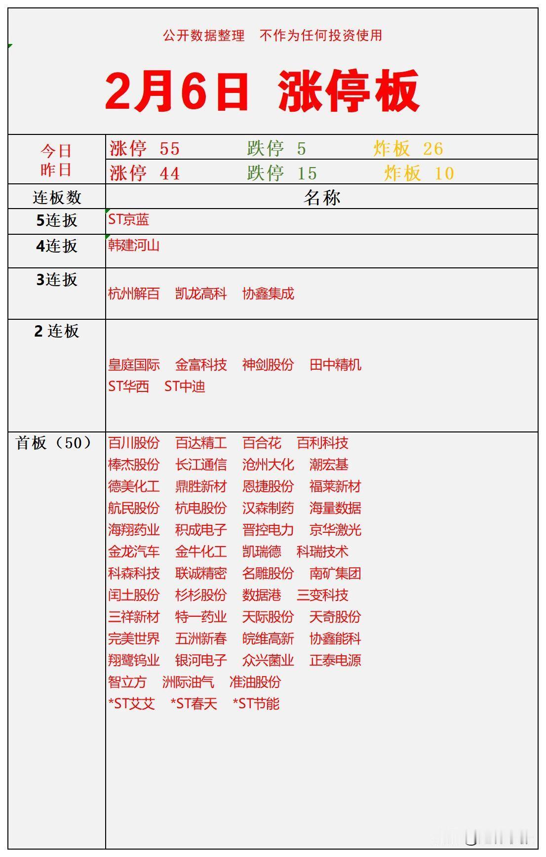 2月6日A股涨停复盘:今日共55家公司收获涨停,相比昨日增加11家,市场情绪明显回暖。连板梯队清晰,ST京蓝拿下5连板,韩建河山紧随其后晋级4连板,杭州解百、凯龙高科、协鑫集成等3只个股强势3连板。炸板家数增至26家,资金分歧有所加大,操作上建议关注连板龙头的持续性,以及首板中低位补涨机会。 个人观点仅供参考!