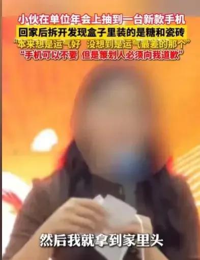“玩不起吗?”广东珠海,男子在年会抽奖,得了特等奖,奖品是价值9988元的手机,老板亲自颁奖,男子想把这个运气送给妻子,他没有当场拆开,他要给妻子一个惊喜,不料妻子拆开,里面居然是两块瓷砖,他很气愤,感到被欺骗了,并且这件事老板居然是不知情的。 这事传上网,评论区直接炸了锅。有人说这是“年度最笋整活”,更多人替这小伙子抱不平。本来开开心心盼着给老婆个惊喜,结果惊喜变惊吓,换谁都得窝火。 年会抽奖图的就是个彩头,图的是老板大方、公司暖心。这倒好,策划人把员工当猴耍,拿“恶作剧”当幽默,把职场最基本的信任按在地上摩擦。 你说要是当场拆开,大伙一笑了之,可能也就过去了。偏这小伙子想给老婆留惊喜,愣是把“炸弹”抱回了家。等老婆满心欢喜拆包装,摸到硬邦邦的瓷砖,那心情从云端跌到谷底,换谁都得气炸。 更讽刺的是,老板从头到尾被蒙在鼓里。他亲手把“特等奖”递出去,以为送出的是公司诚意,没想到成了策划人整蛊的道具。这波操作不仅寒了员工的心,还让老板跟着背锅,里外不是人。 这种玩笑一点都不好笑。打工人一年到头就盼着年会这点甜头,结果被当成取乐的工具。要是公司实在预算有限,大不了奖品接地气点,哪怕是米面油,也比拿瓷砖骗人强。 职场里的信任就像纸,揉皱了就再也展不平。员工嘴上不说,心里都记着。今天你拿抽奖当儿戏,明天员工就拿工作当应付。别拿“开玩笑”当遮羞布,玩不起就别办年会,办了就拿出点诚意。 各位读者你们怎么看?欢迎在评论区讨论。