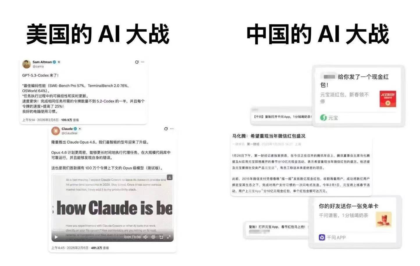 #千问送奶茶背后有阳谋# 看到这个图一,说中国的AI大战和美AI大战的区别,这图的内涵。可能褒贬的意思都有一些。我们的确是客观理性的思考,想起了我在2023年写的一个帖子。中国科技互联网公司的优势很明显,更擅长普及落地。当然,我们的底层架构的创新能力也正在快速提高。