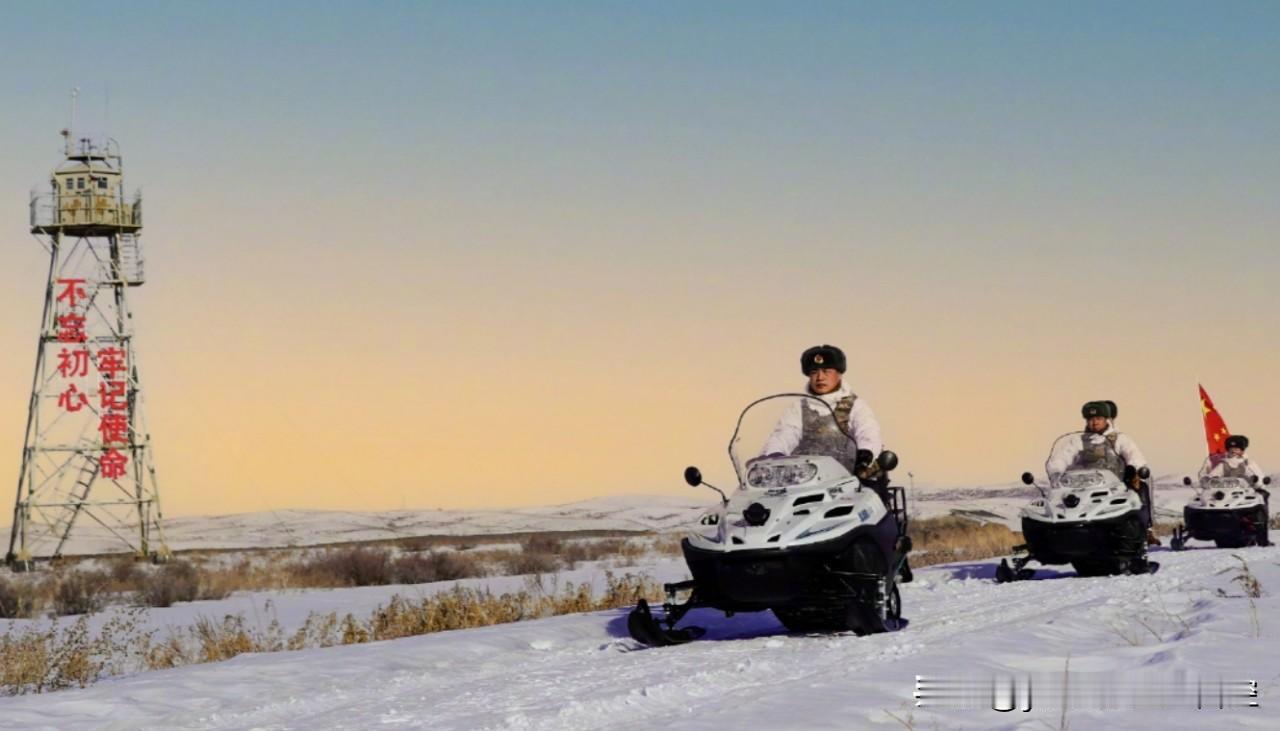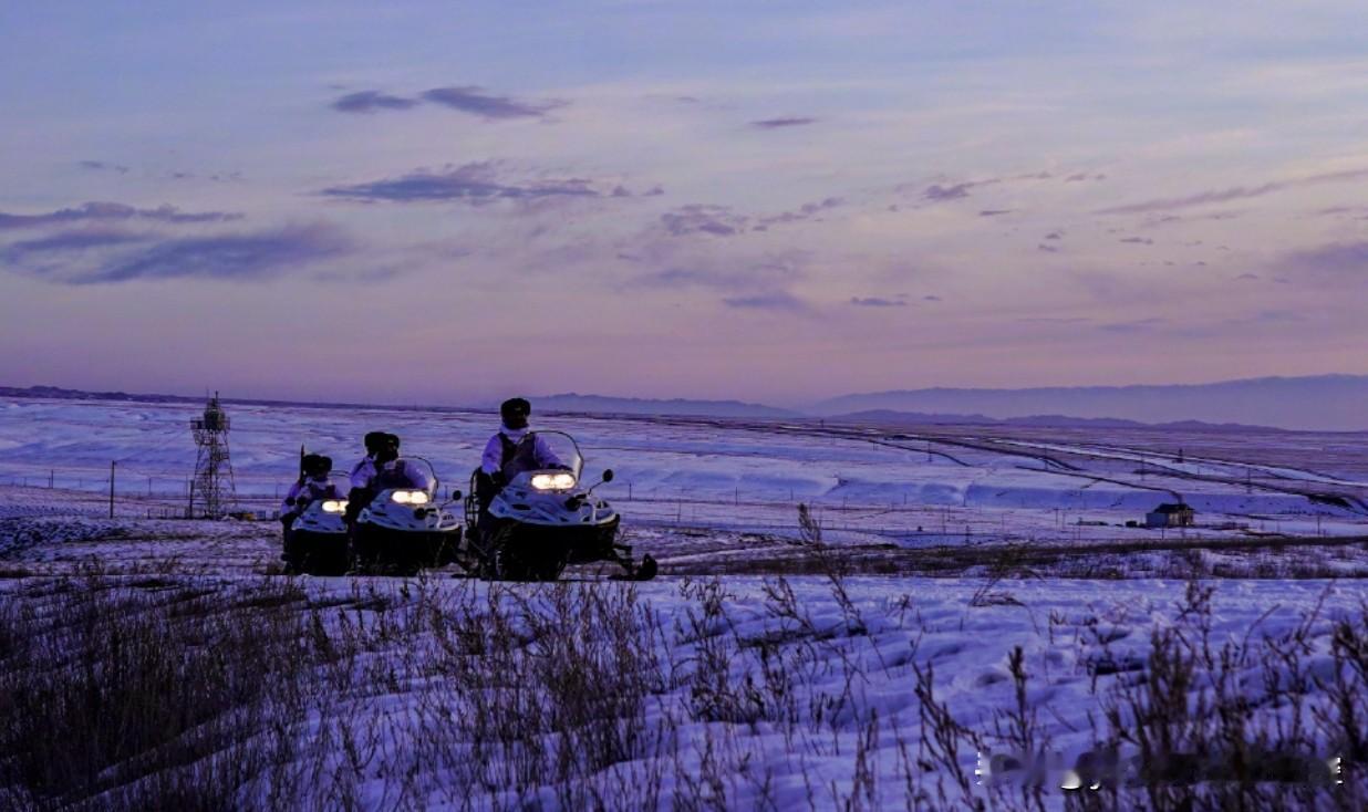 边防战士驾驶摩托雪橇巡逻,边塞黄昏很美!